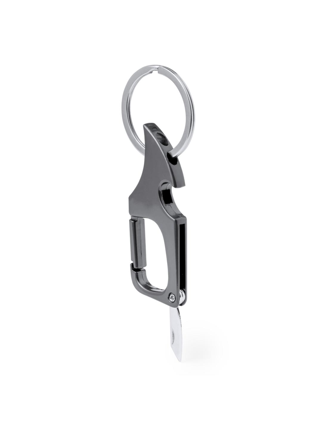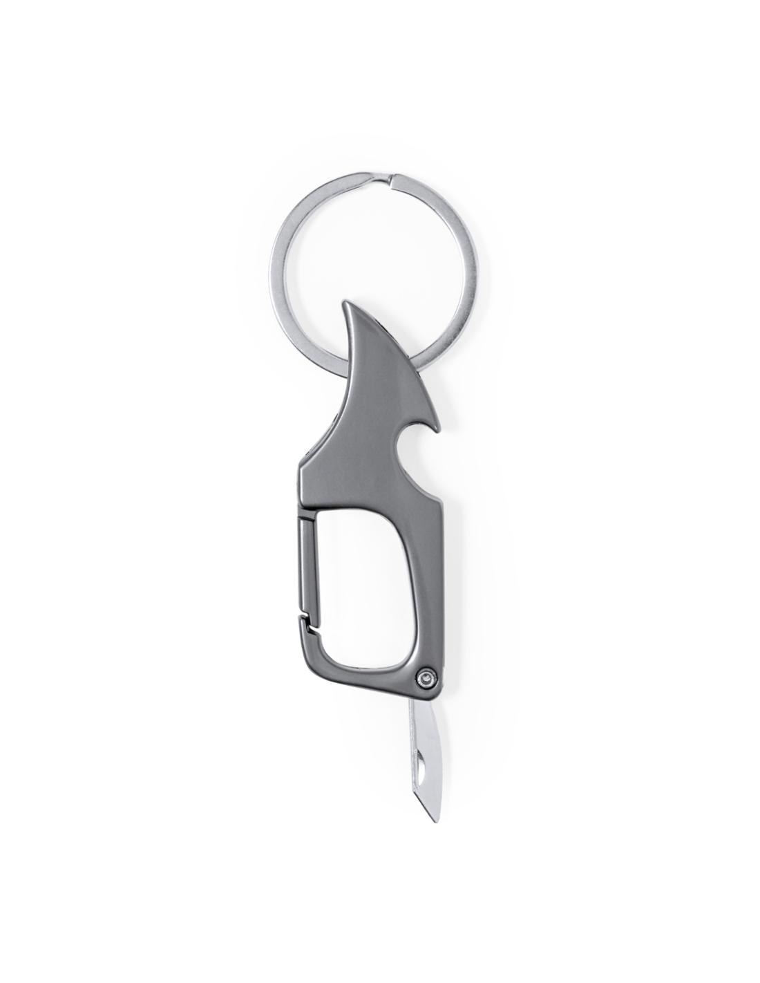 Práctico llavero abridor metálico. Con anilla para llavero y mosquetón para un rápido enganche. Con abrebotellas en uno de sus extremos, incorpora un pequeño cuchillo de acero inox en el extremo opuesto, ideal para abrir cartas, paquetes, etc. En elegante color negro metalizado y presentado en bolsa de papel reciclada.