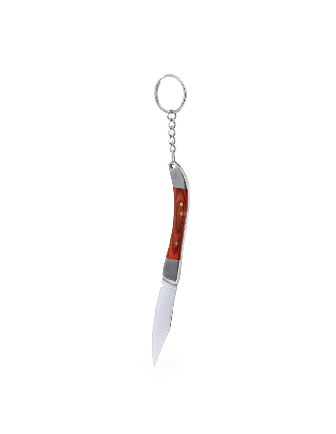 Práctico llavero navaja con hoja de acero inox y resistente empuñadura metálica con detalles en madera natural. Presentado en caja de diseño kraft.