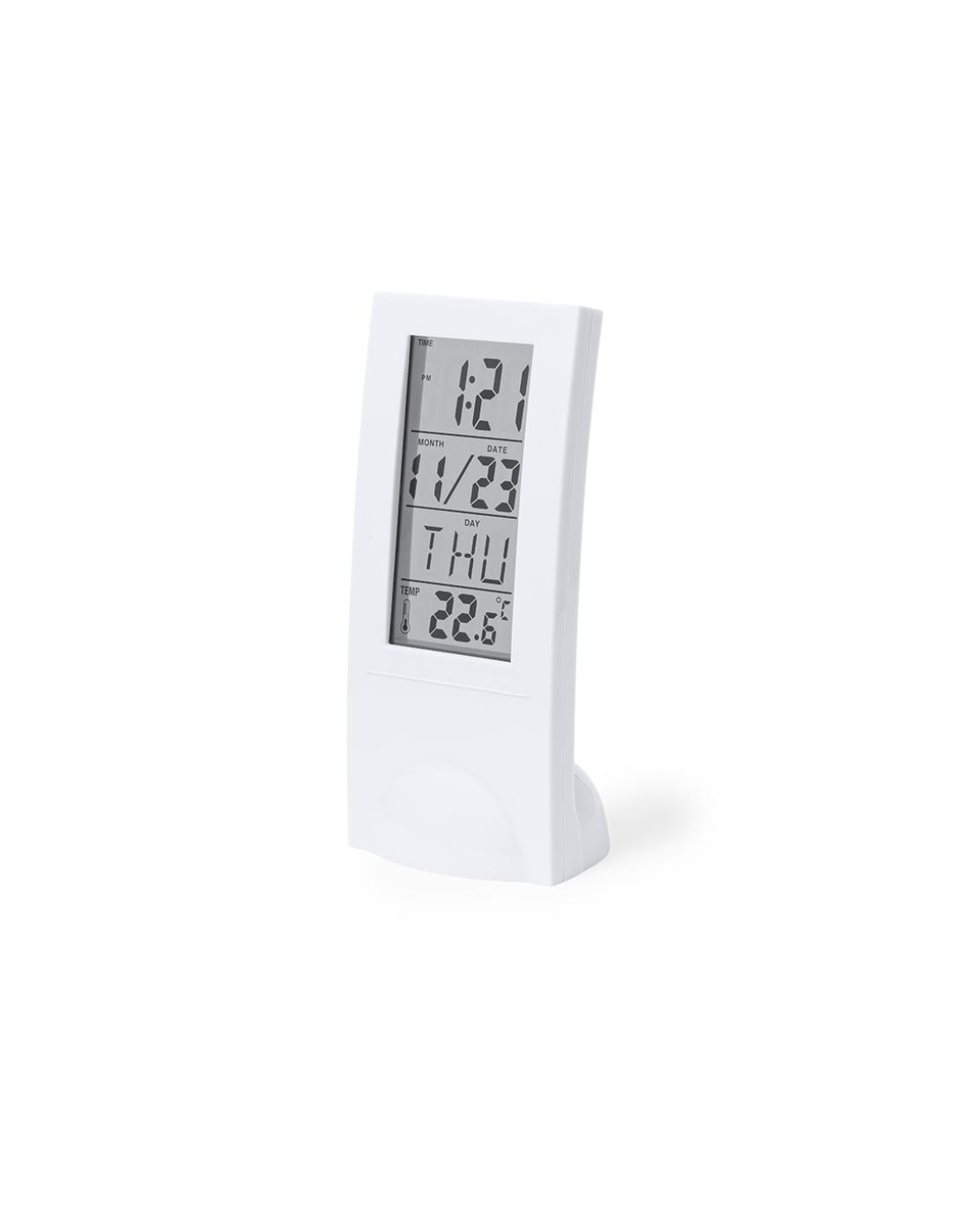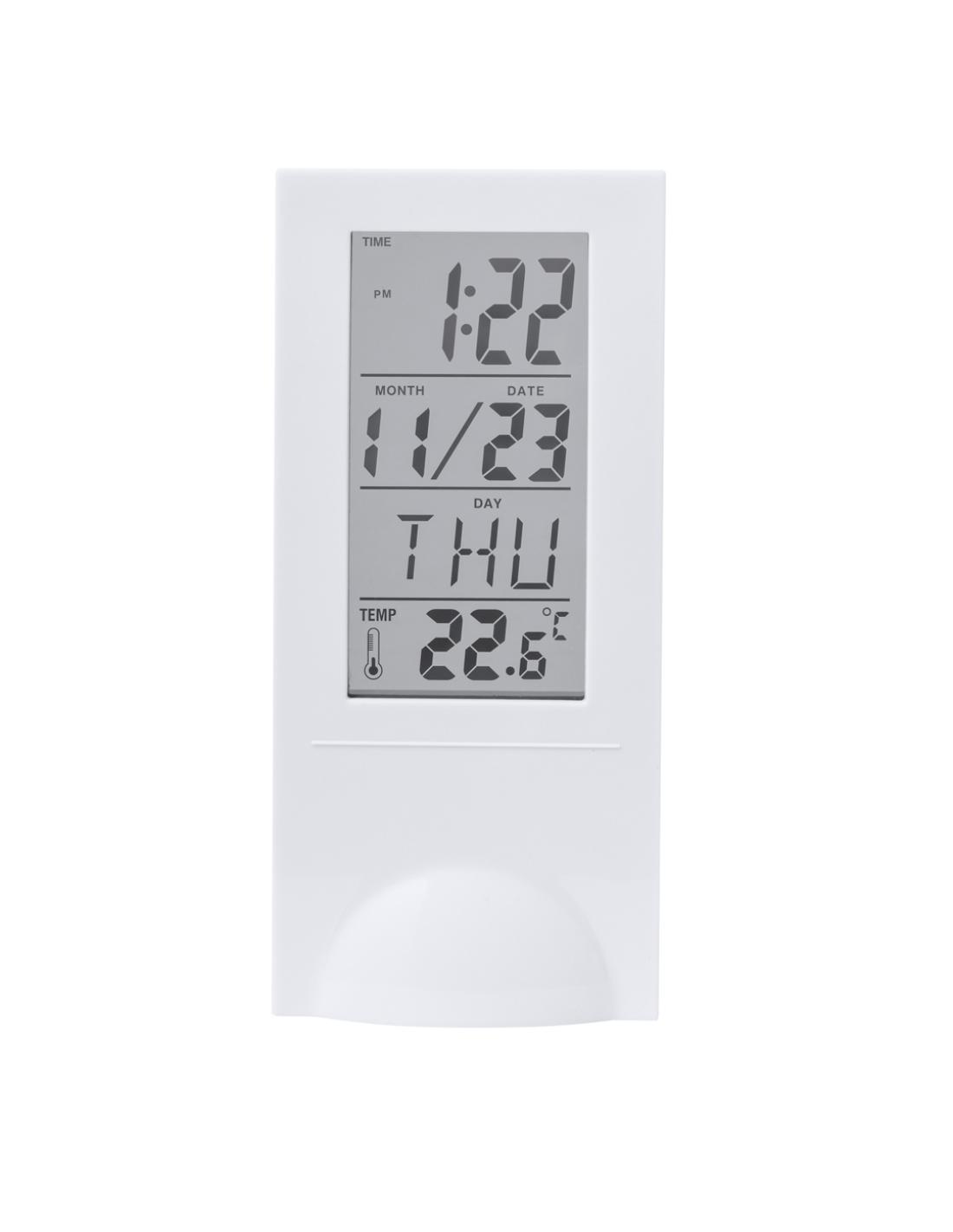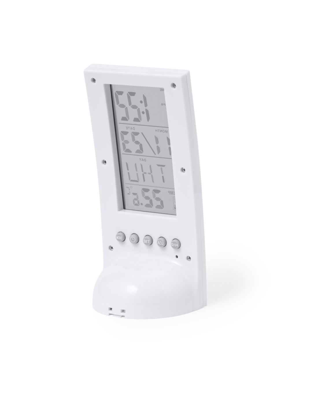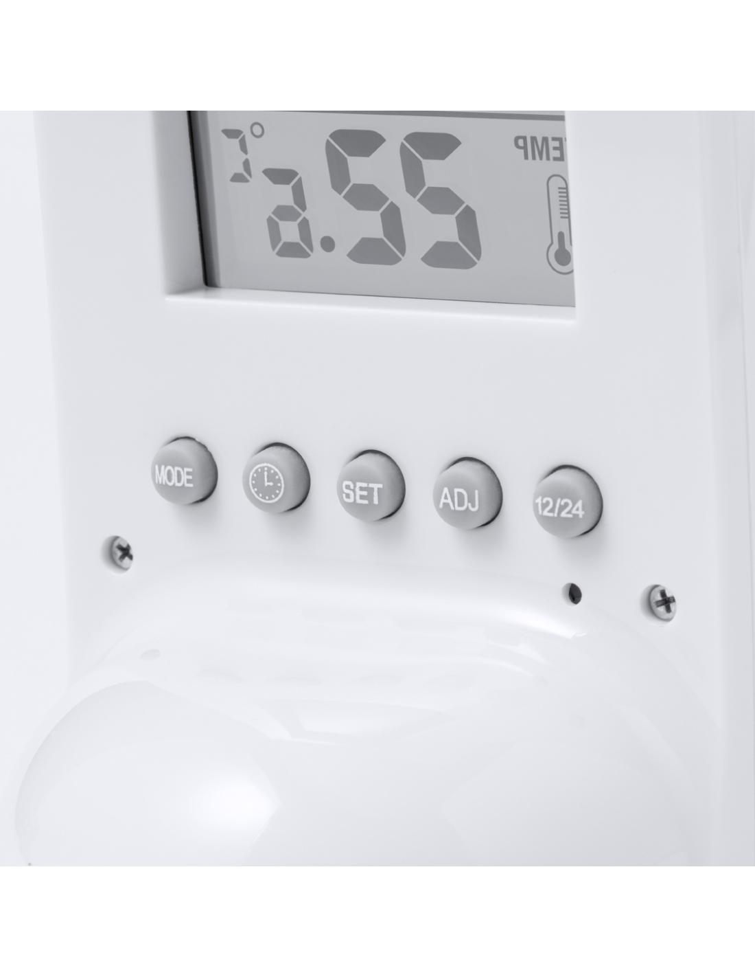 Estación meteorológica fabricada en resistente ABS, con sensor de temperatura. Función de hora (12/24), calendario, alarma y día de la semana. Con base soporte y botones de control traseros. Alimentación a pilas (2xAAA no incluidas) y presentada en atractiva caja de diseño kraft. Disponible manual de instrucciones en español e inglés.