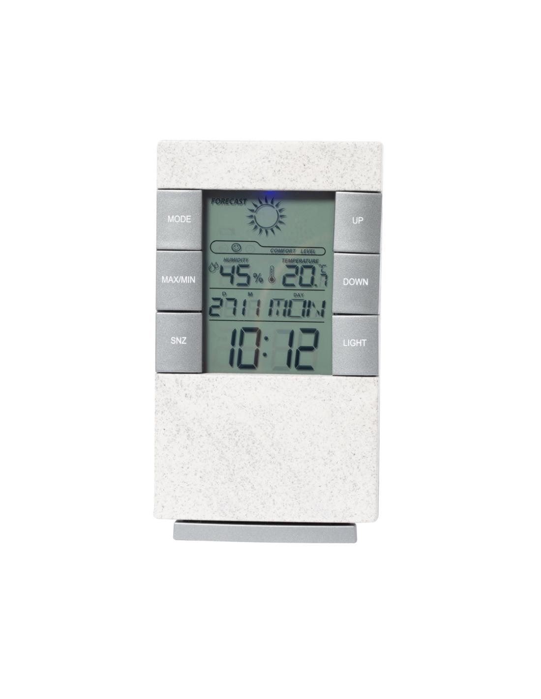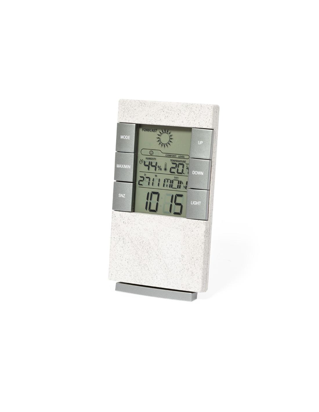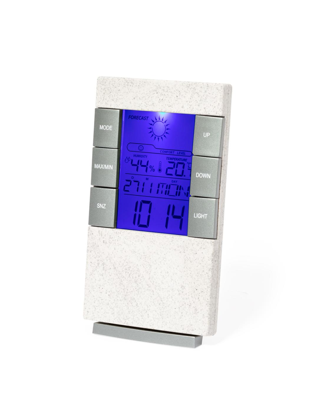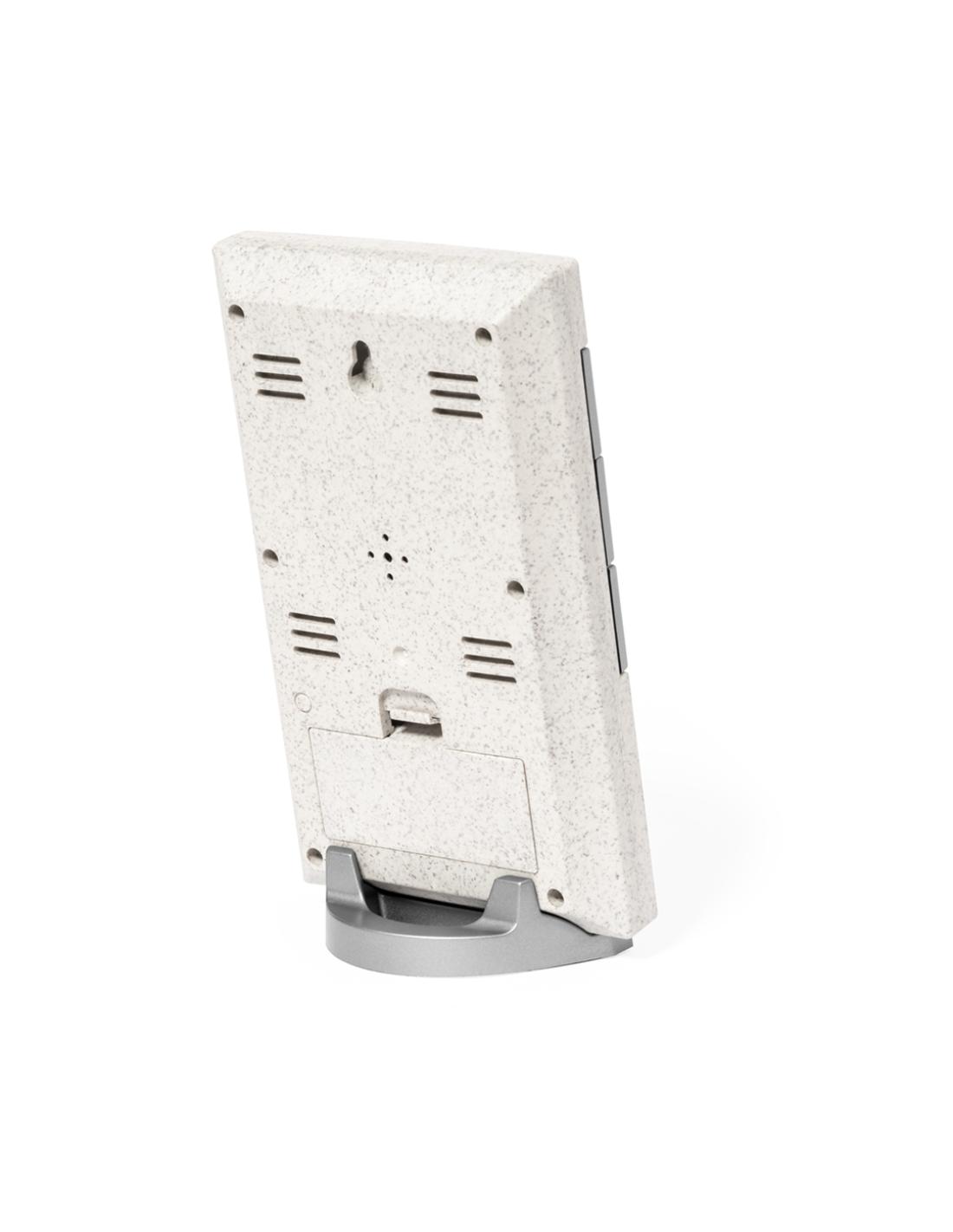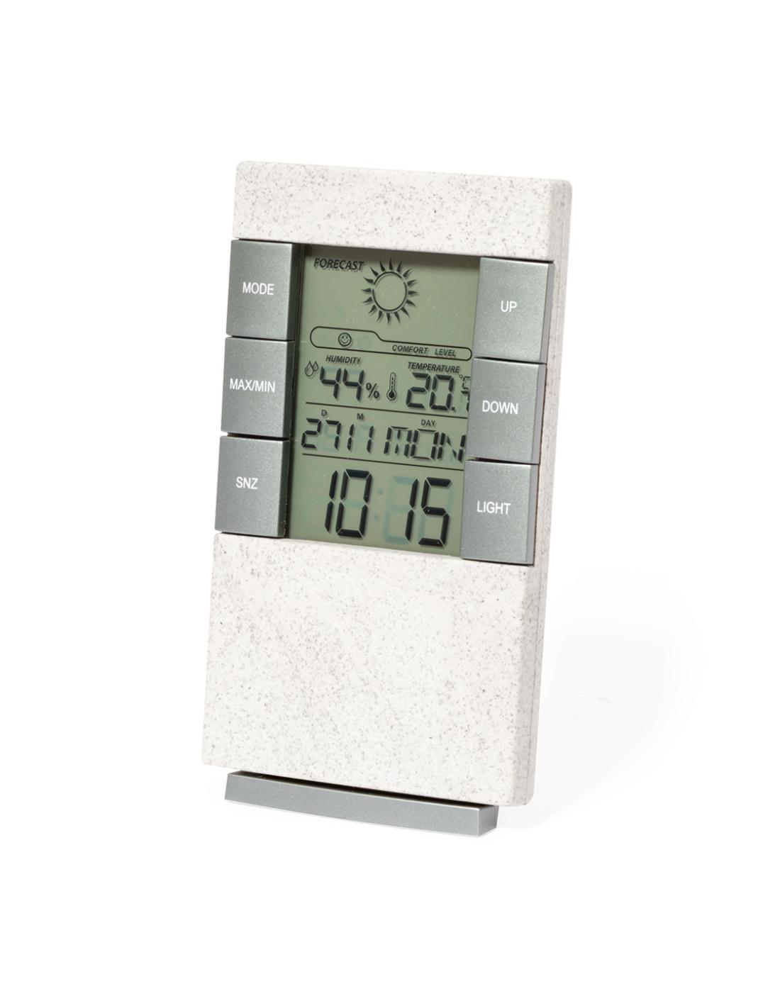 Estación meteorológica fabricada en caña de trigo, con termómetro e higrómetro. Función de hora, calendario, alarma y día de la semana, fácilmente visibles en la pantalla retroiluminada. Con base soporte y enganche para colgarlo. Alimentación a pilas (2xAAA no incluidas) y presentada en atractiva caja de diseño kraft. Disponible manual de instrucciones en español e inglés.La caña de trigo fomenta la utilización de materias primas naturales, reduciendo así las emisiones contaminantes.
