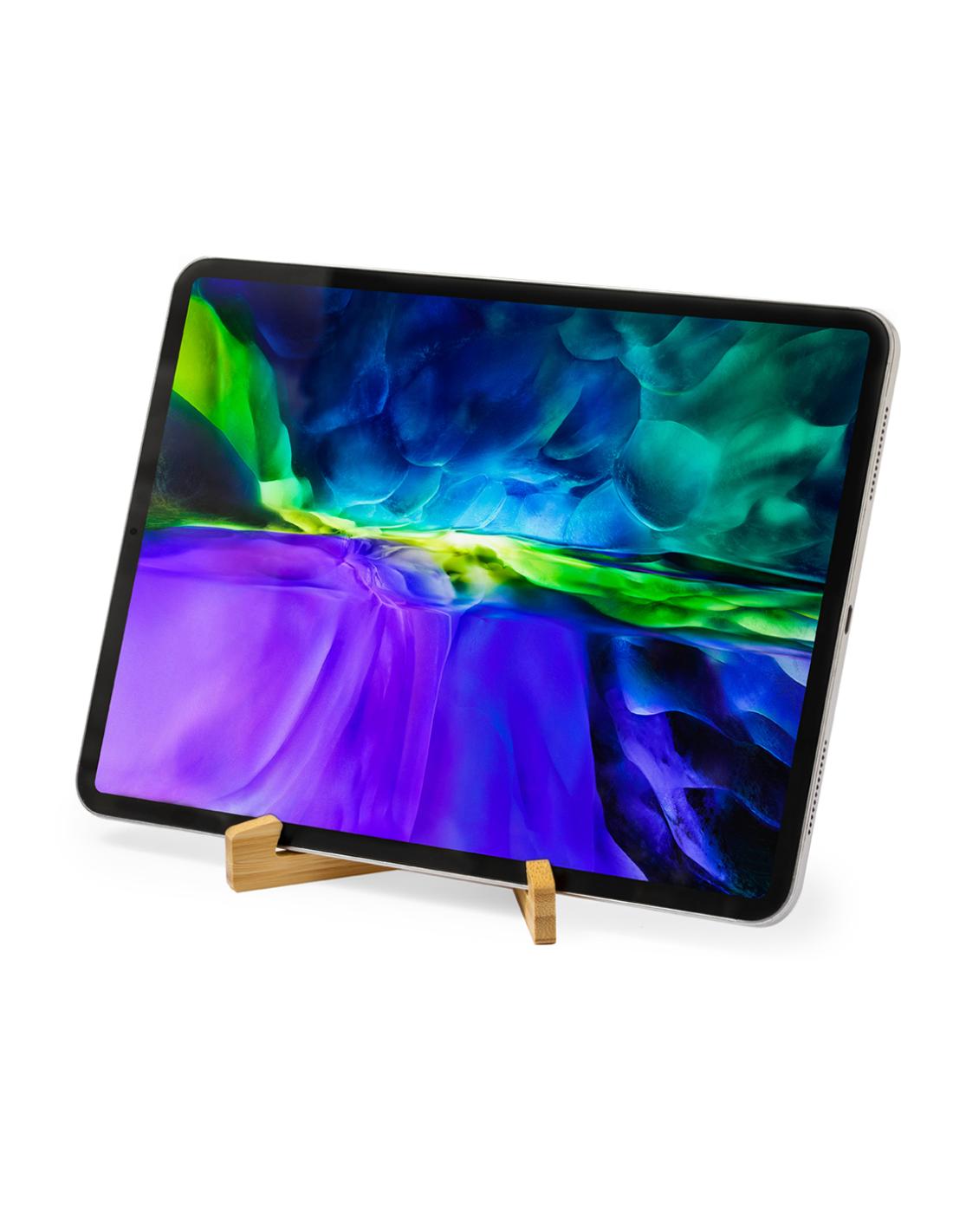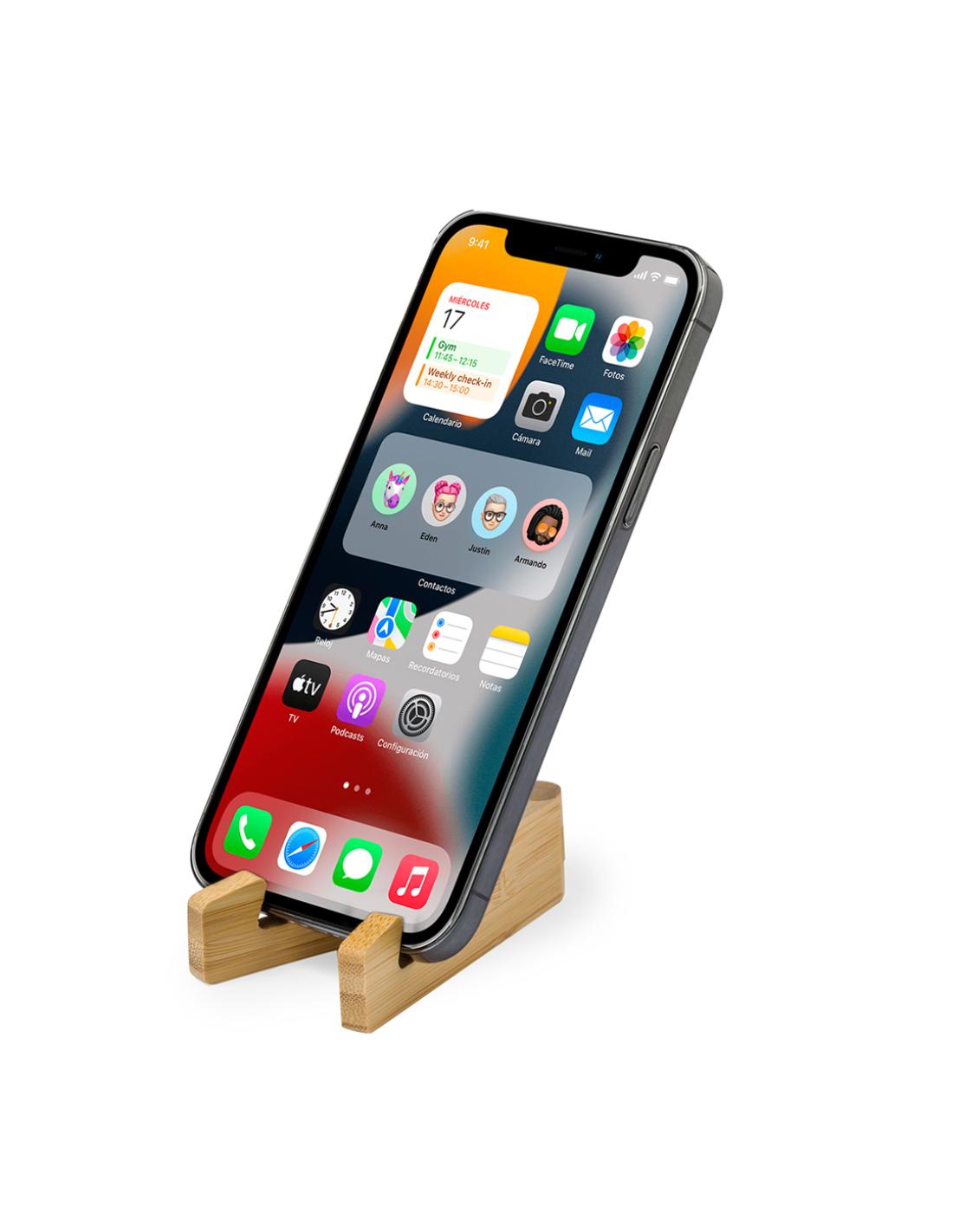 Soporte plegable para dispositivo móvil fabricado en resistente bambú. Con patas ajustables y presentado individualmente en bolsa de papel reciclado. Materiales como el bambú fomentan la utilización de materias primas naturales, reduciendo las emisiones contaminantes. Proviene de una planta de gran resistencia y versatilidad, con crecimiento y regeneración rápidos, siendo una excelente alternativa al uso de madera tradicional.