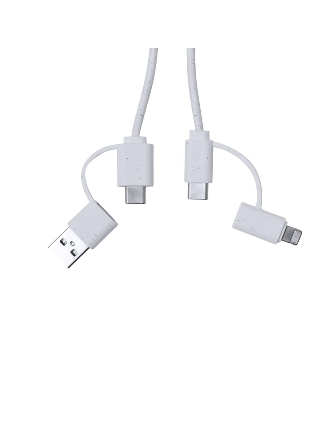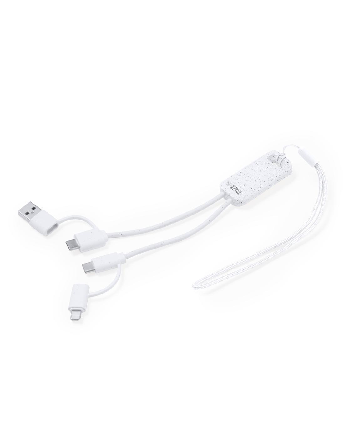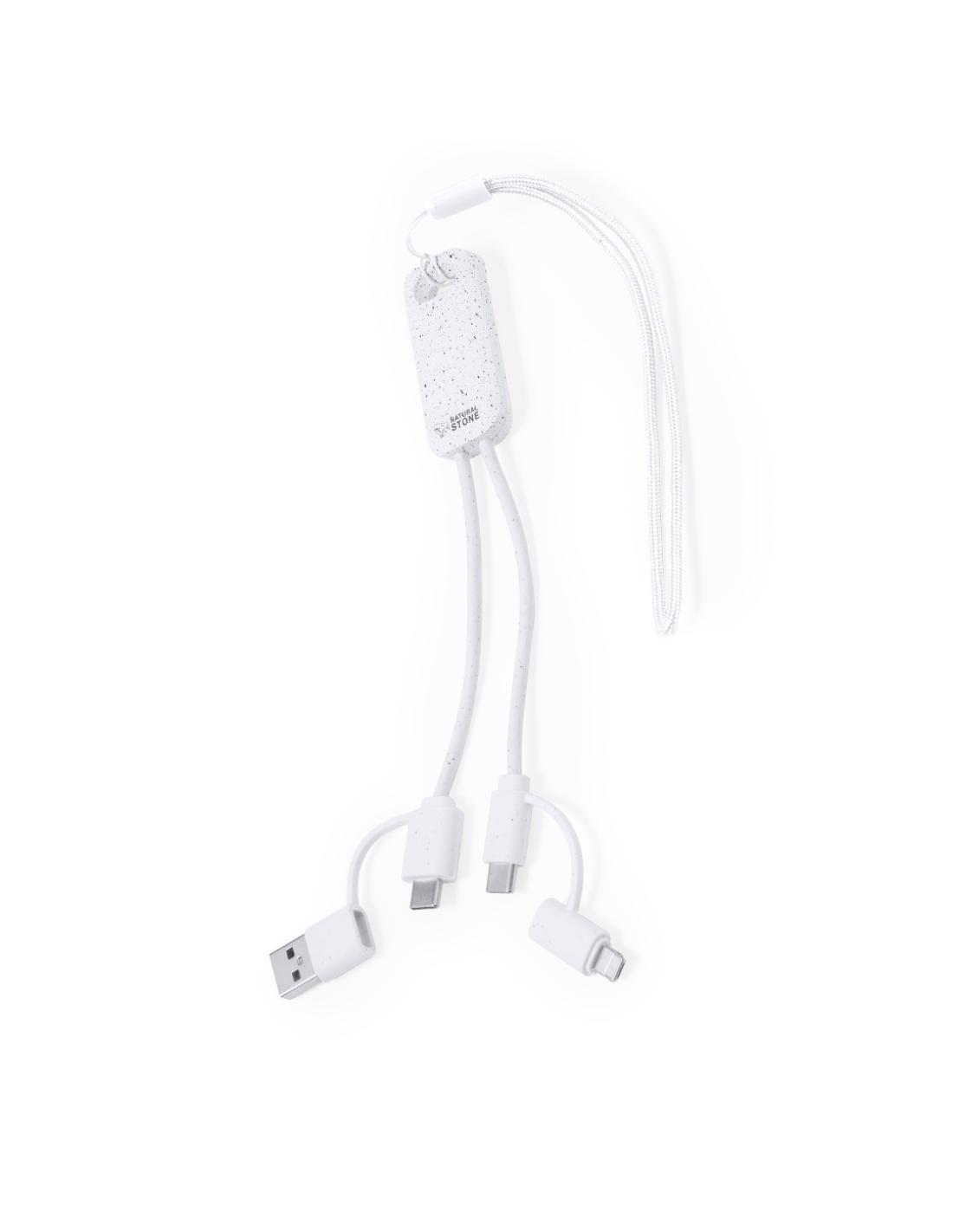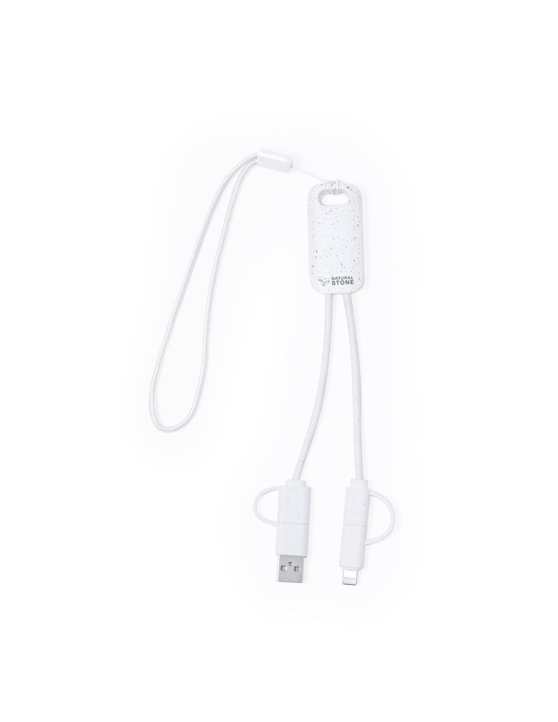 Cable cargador fabricado a partir de extractos de piedra natural en combinación con resistente ABS. Con conexiones de entrada Tipo C/USB y salidas Tipo C, Lightning y Micro USB. 5V DC 2.4A. Presentado en caja individual de diseño kraft.Fabricado con extractos de piedra natural, ayudando a la reducción del uso de plásticos, además de proporcionar un acabado suave y resistente.