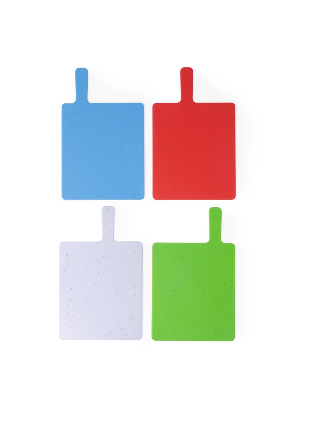 Set de tablas fabricadas en resistente PP. Incluye cuatro tablas con un soporte para un almacenamiento ordenado. Cada tabla es fácilmente identificable gracias a los dibujos grabados y los diferentes colores, para diferentes tipos de alimentos. Presentado en caja de diseño kraft.