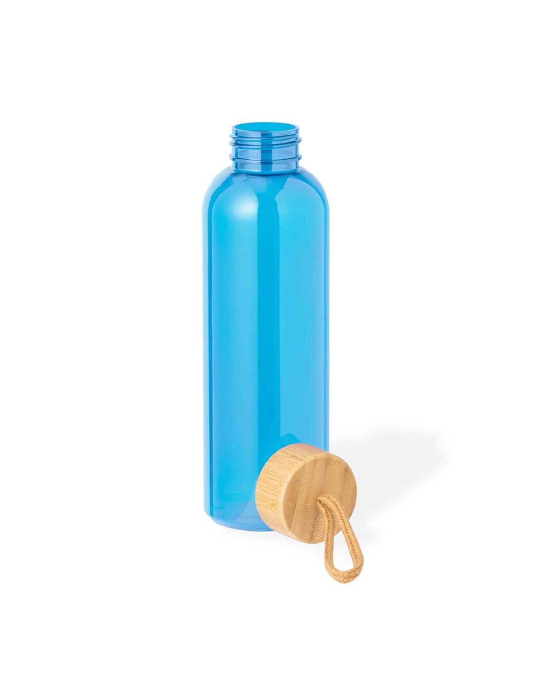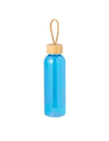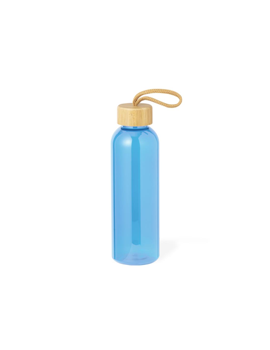 Bidón fabricado en RPET de 650 ml de capacidad, libre de BPA. Tapón a rosca en bambú, con cordón de transporte trenzado. Disponible en variada gama de colores. Presentado individualmente en bolsa de papel.