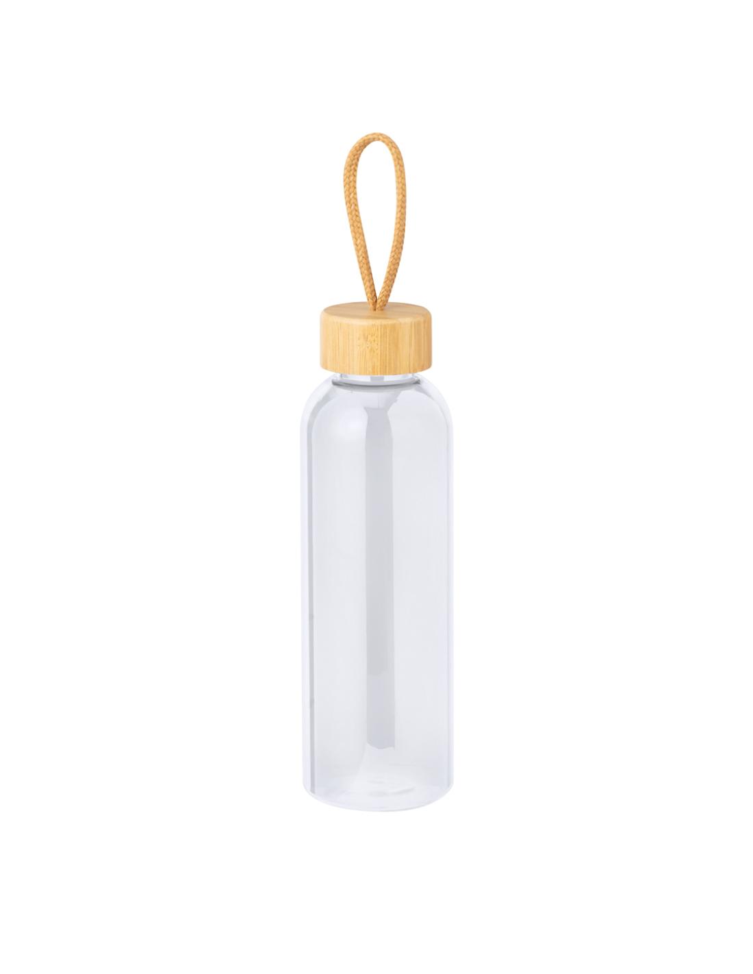 Bidón fabricado en RPET de 650 ml de capacidad, libre de BPA. Tapón a rosca en bambú, con cordón de transporte trenzado. Disponible en variada gama de colores. Presentado individualmente en bolsa de papel.