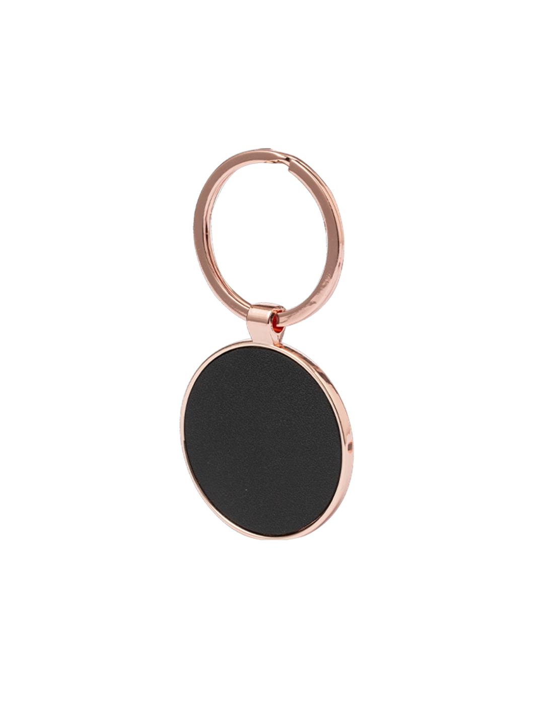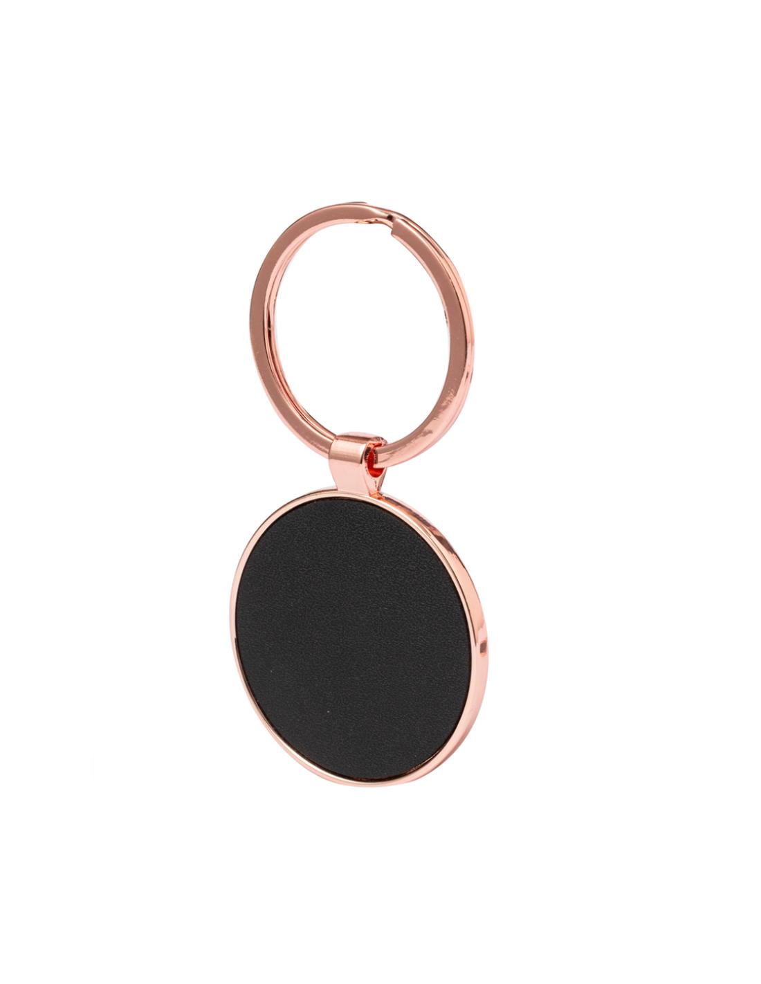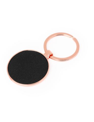 Llavero metálico de sofisticado diseño, con recubrimiento de cobre galvanizado y acabado brillo. Forrado en elegante polipiel en una de sus caras y disponible en diseño rectangular y circular. Presentado individualmente bolsa de papel reciclado.