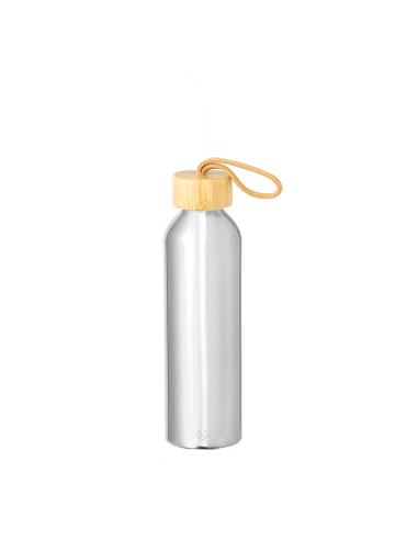 Bidón en Aluminio Reciclado de 600 ml de capacidad. De originales y variados colores pastel metalizados. Tapón a rosca en bambú con cordón de transporte trenzado. Presentado en una caja de diseño kraft.