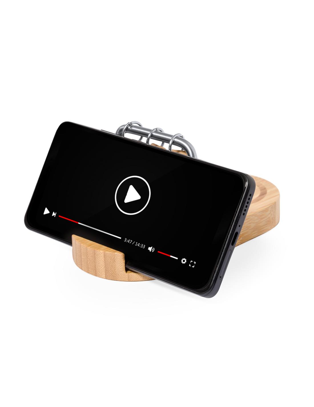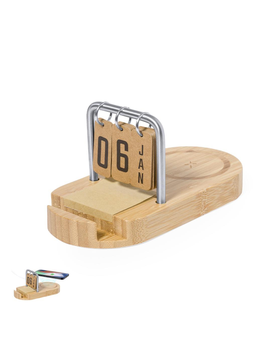 Cargador multifunción inalámbrico 15W fabricado en bambú. Incluye soporte para smartphone y calendario perpetuo, además de un bloc con 50 notas adhesivas acabado kraft de 4,5x4,5 cm. Salida USB y entrada y salida Tipo C, permitiendo cargar de manera simultánea hasta 3 dispositivos (1 mediante carga inalámbrica, 1 mediante cable Tipo C y 1 por cable USB). Compatible con dispositivos equipados con tecnología de carga inalámbrica. Amplia superficie de marcaje y presentado en caja individual de diseño kraft.Materiales como el bambú fomentan la utilización de materias primas naturales, reduciendo las emisiones contaminantes. Proviene de una planta de gran resistencia y versatilidad, con crecimiento y regeneración rápidos, siendo una excelente alternativa al uso de madera tradicional.Fabricado conforme a los...
