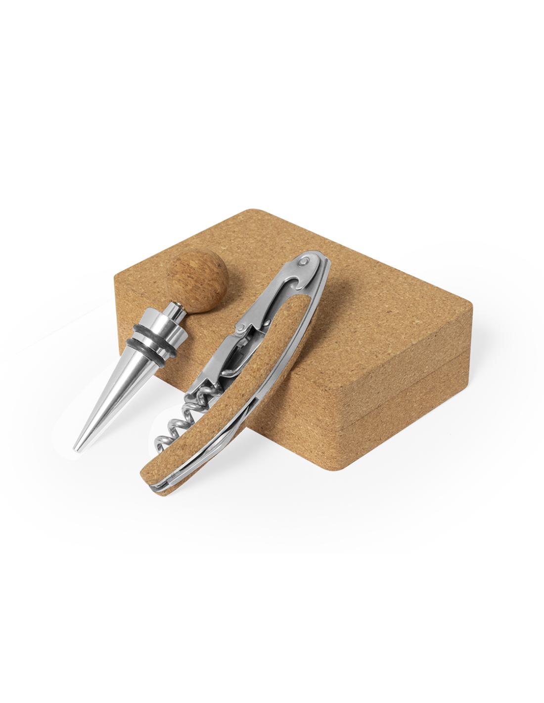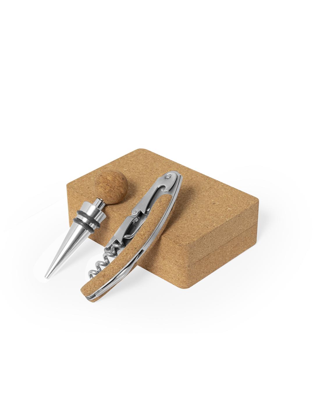 Set de vinos acabado en corcho. Accesorios de acero inox. Incluye sacacorchos de dos tiempos y tapón. Presentado en estuche individual de corcho, con interior troquelado y fijación con imanes.Elaborado con elementos vegetales para así fomentar la utilización de materias primas naturales y reducir las emisiones contaminantes.