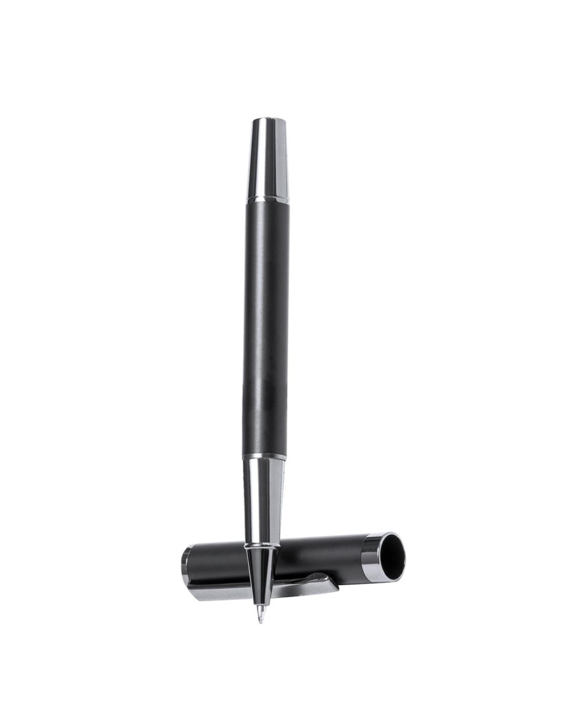 Elegante set de bolígrafo y roller. Bolígrafo de mecanismo giratorio y roller con capucha, ambos provistos de un clip metálico. Con tinta azul, su cuerpo presenta un elegante acabado negro mate y sutiles detalles cromados. Presentados en un estuche kraft negro, con interior troquelado en tacto de terciopelo.
