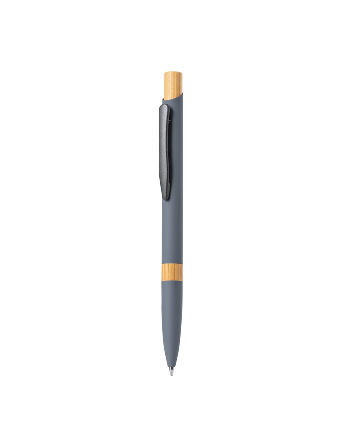 Elegante bolígrafo de aluminio con mecanismo pulsador. Cuerpo en resistente aluminio de acabado goma mate y con detalles en bambú, con caña en una amplia gama de distintivos colores. Clip metálico, de carga jumbo y en tinta azul. Presentado en bolsa individual reciclada.Materiales como el bambú fomentan la utilización de materias primas naturales, reduciendo las emisiones contaminantes. Proviene de una planta de gran resistencia y versatilidad, con crecimiento y regeneración rápidos, siendo una excelente alternativa al uso de madera tradicional.