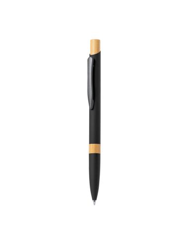 Elegante bolígrafo de aluminio con mecanismo pulsador. Cuerpo en resistente aluminio de acabado goma mate y con detalles en bambú, con caña en una amplia gama de distintivos colores. Clip metálico, de carga jumbo y en tinta azul. Presentado en bolsa individual reciclada.Materiales como el bambú fomentan la utilización de materias primas naturales, reduciendo las emisiones contaminantes. Proviene de una planta de gran resistencia y versatilidad, con crecimiento y regeneración rápidos, siendo una excelente alternativa al uso de madera tradicional.