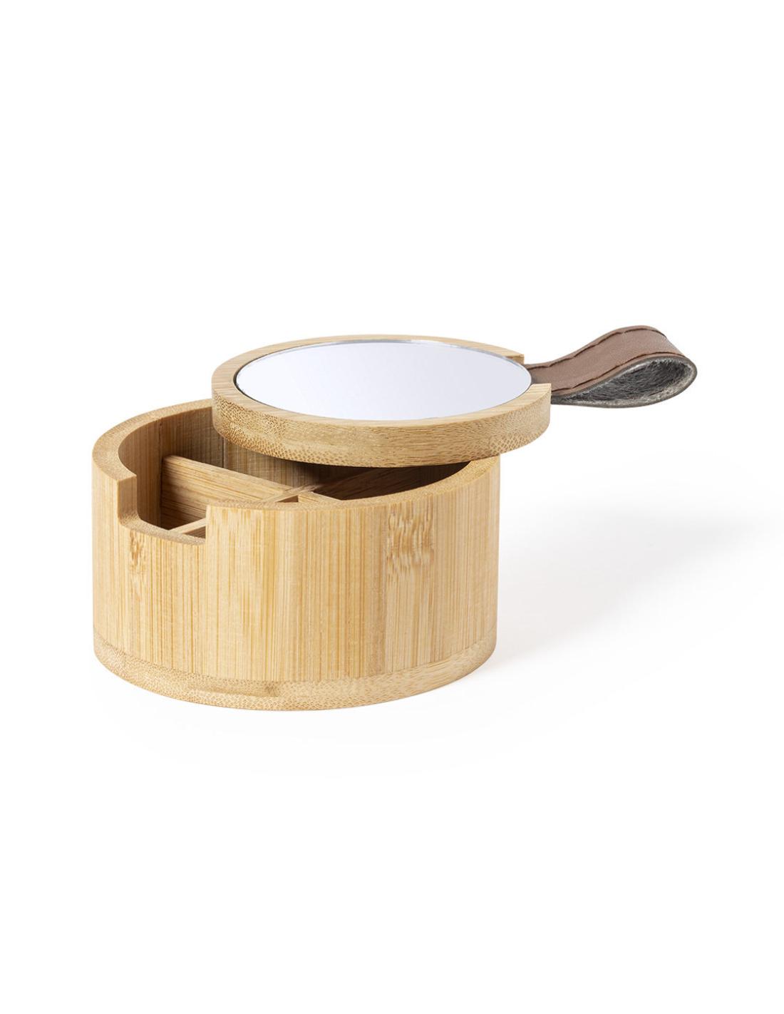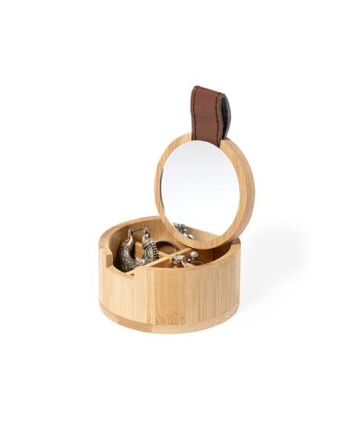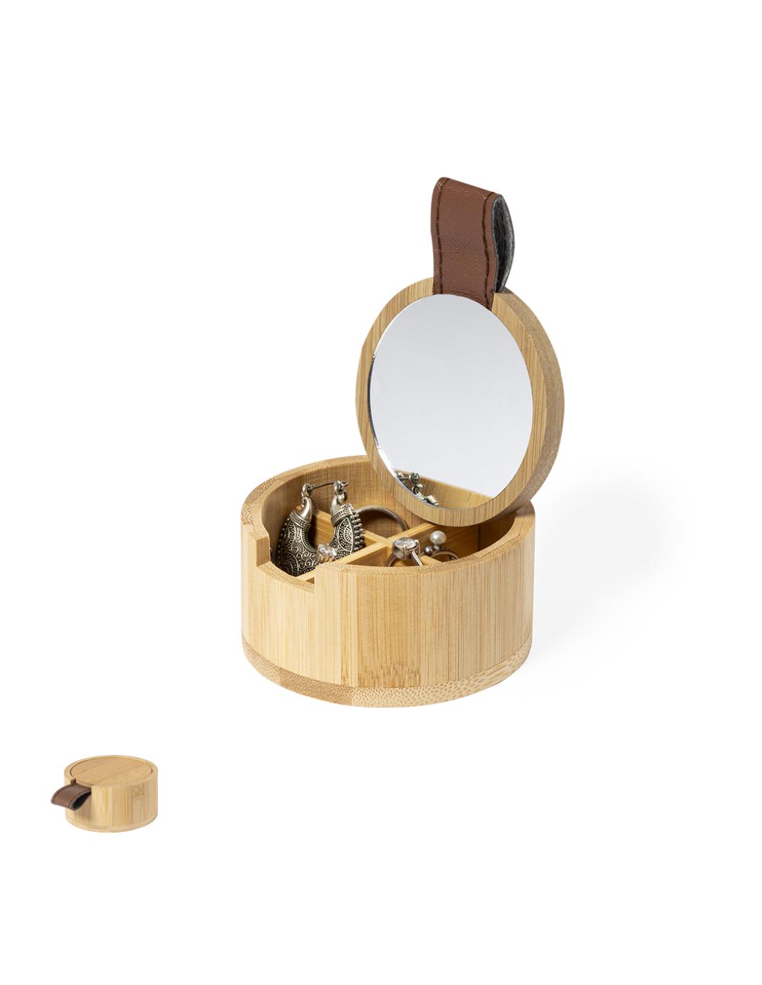 Joyero de línea nature fabricado en bambú. Con 4 compartimentos interiores, tapa con tirador de PU y espejo 1X de 6cm de diámetro integrado en tapa. Con film protector y presentado en caja individual de diseño eco.