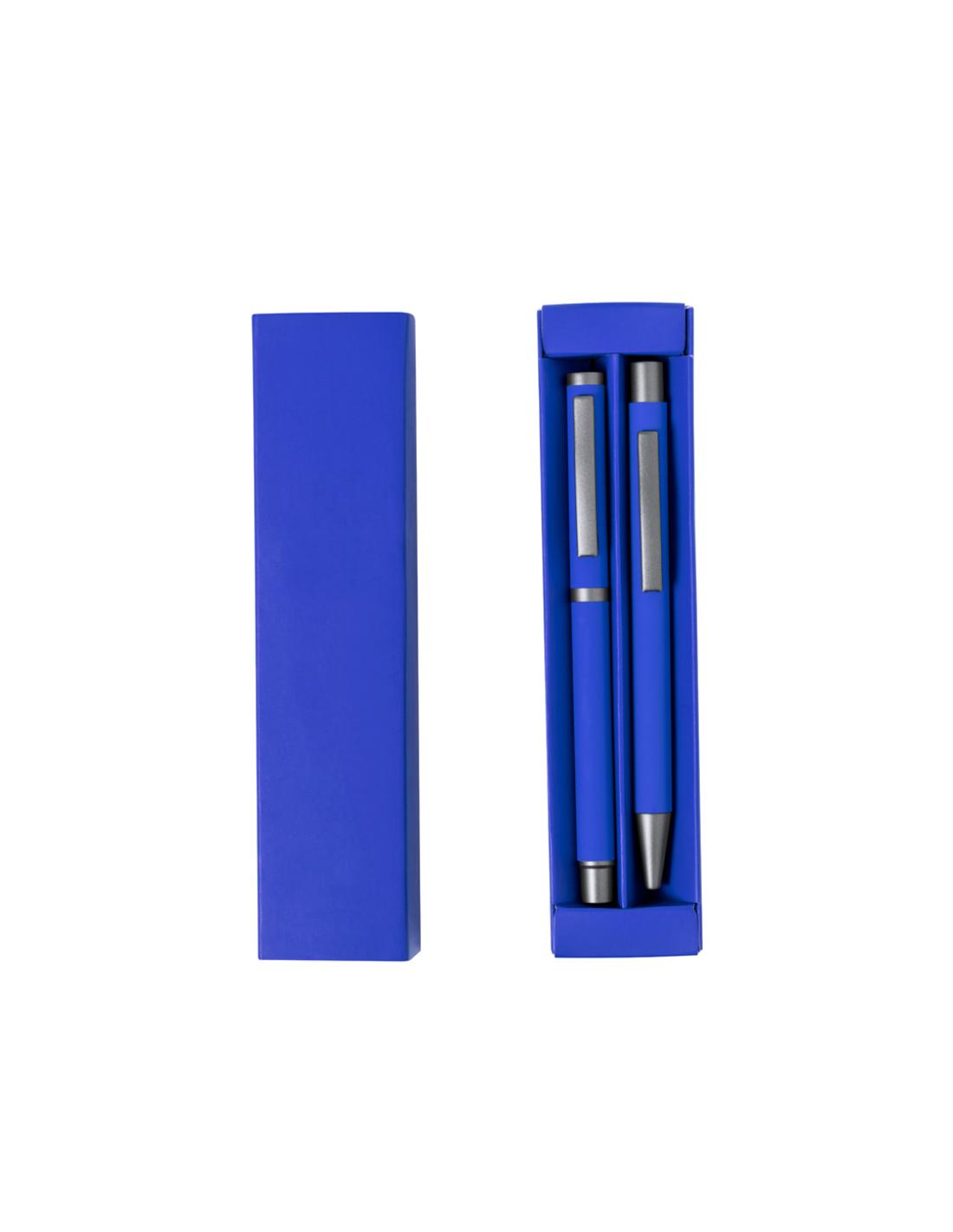 Elegante set de bolígrafo y roller. Bolígrafo de mecanismo pulsador y roller con capucha, ambos con clip metálico, carga jumbo y de tinta azul. Cuerpo en variados colores sólidos acabado goma y detalles metálicos en gris oscuro. Presentados en una caja de variados colores a juego con compartimentos interioriores separados.