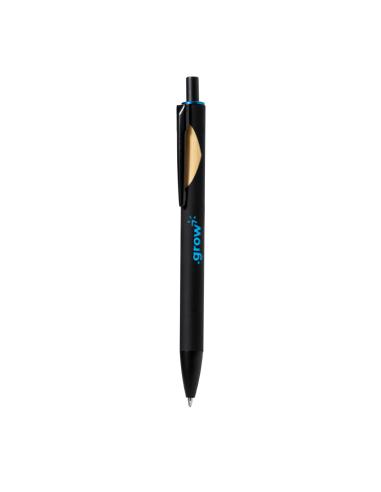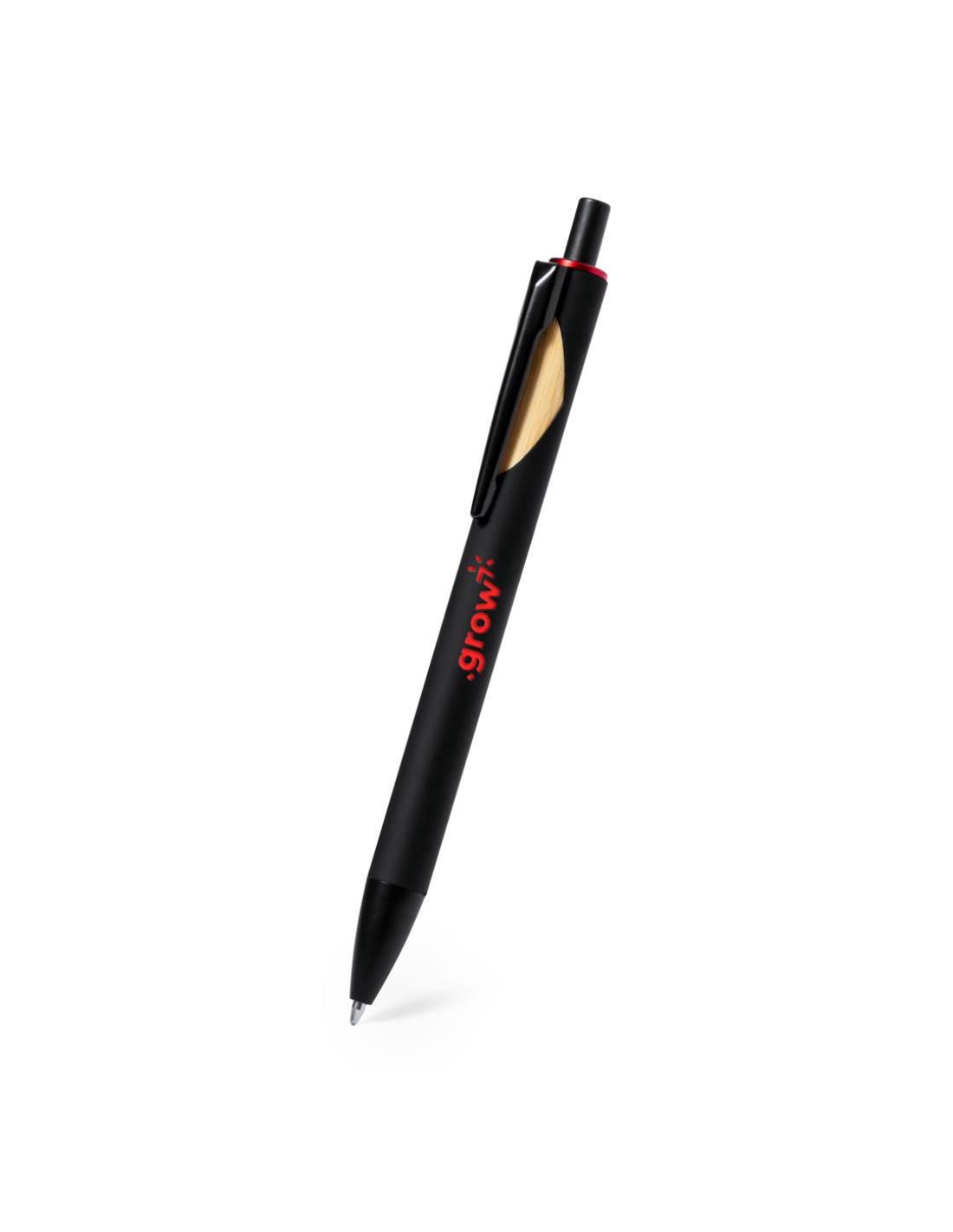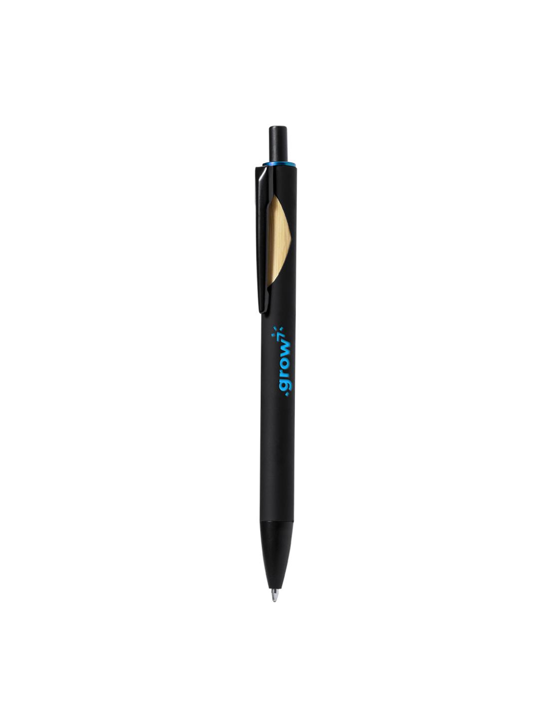 Bolígrafo de mecanismo pulsador con cuerpo de acabado sólido en color negro y detalle superior en variada gama de colores. Clip metálico en color negro con detalle en bambú. Especialmente diseñado para marcaje en láser y con un recubrimiento exterior especial para que tu publicidad quede perfectamente grabada y a juego. En tinta azul. Presentado en bolsa individual reciclada.Materiales como el bambú fomentan la utilización de materias primas naturales, reduciendo las emisiones contaminantes. Proviene de una planta de gran resistencia y versatilidad, con crecimiento y regeneración rápidos, siendo una excelente alternativa al uso de madera tradicional.