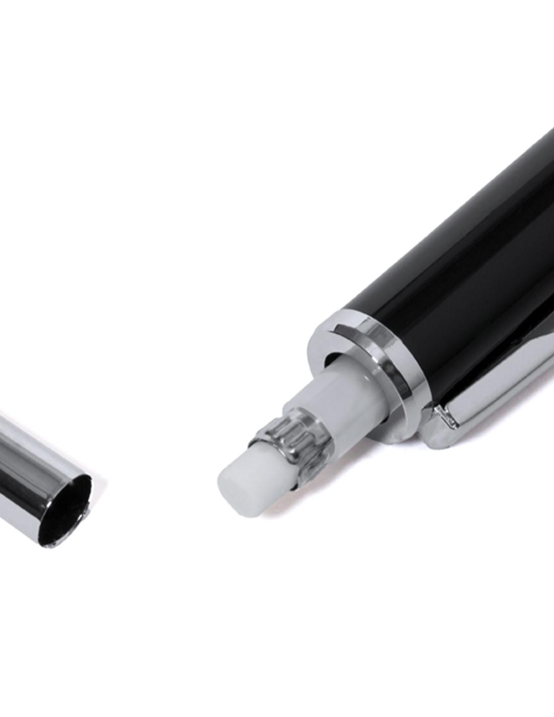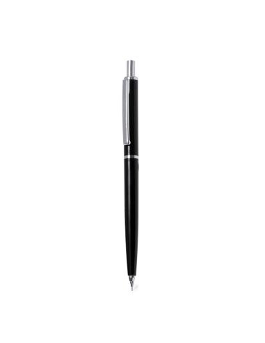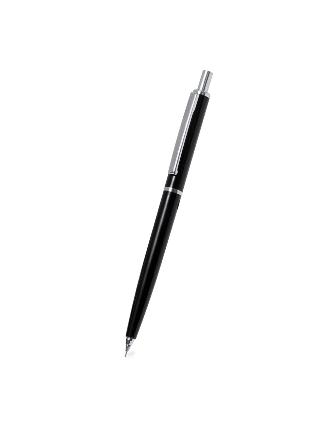 Elegante portaminas hecho en resistente ABS. Cuerpo en color negro y empuñadura a juego de tacto liso, con elementos cromados como botón, clip, punta y anilla central.Con goma y minas incluidas de 0,7 mm.