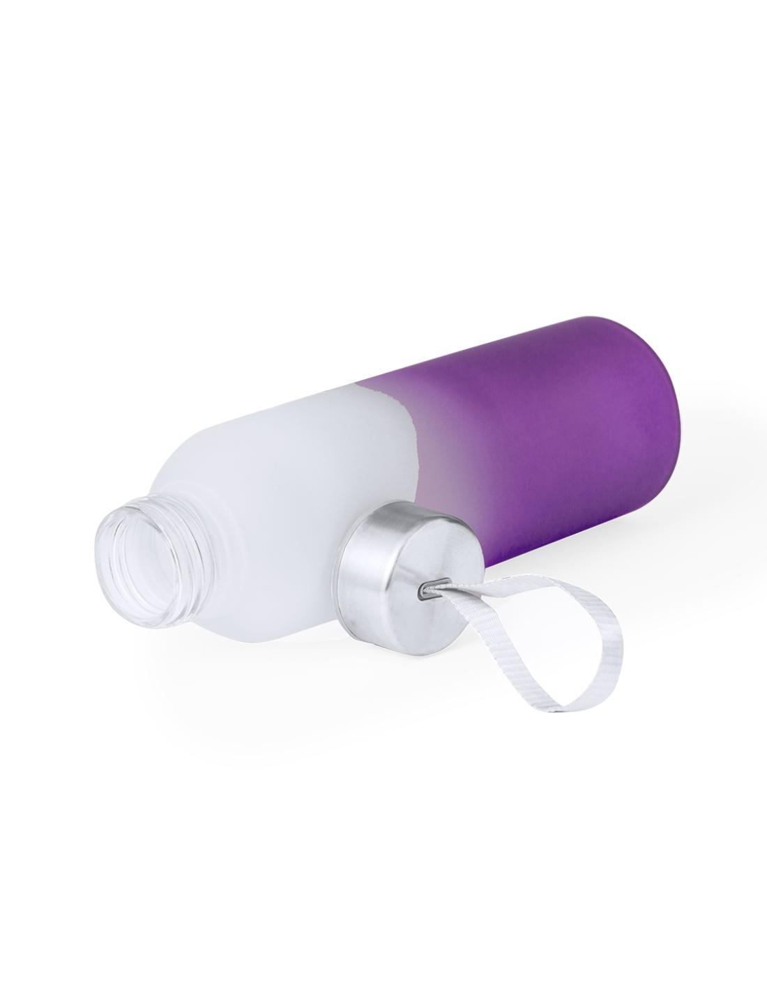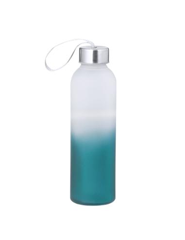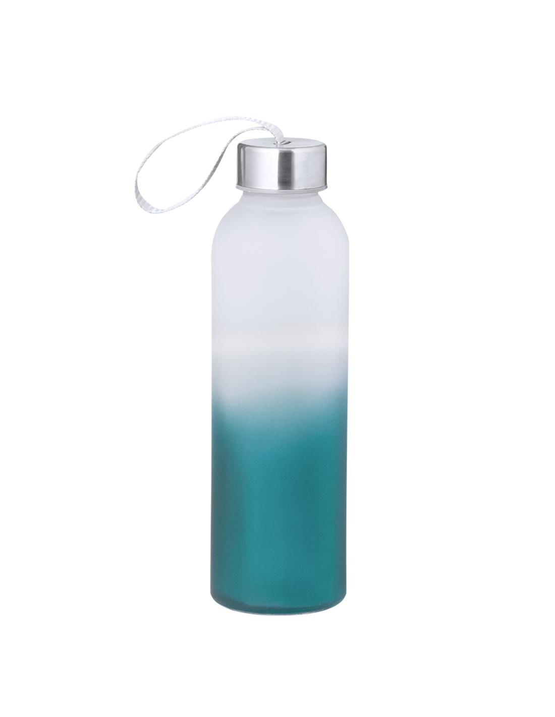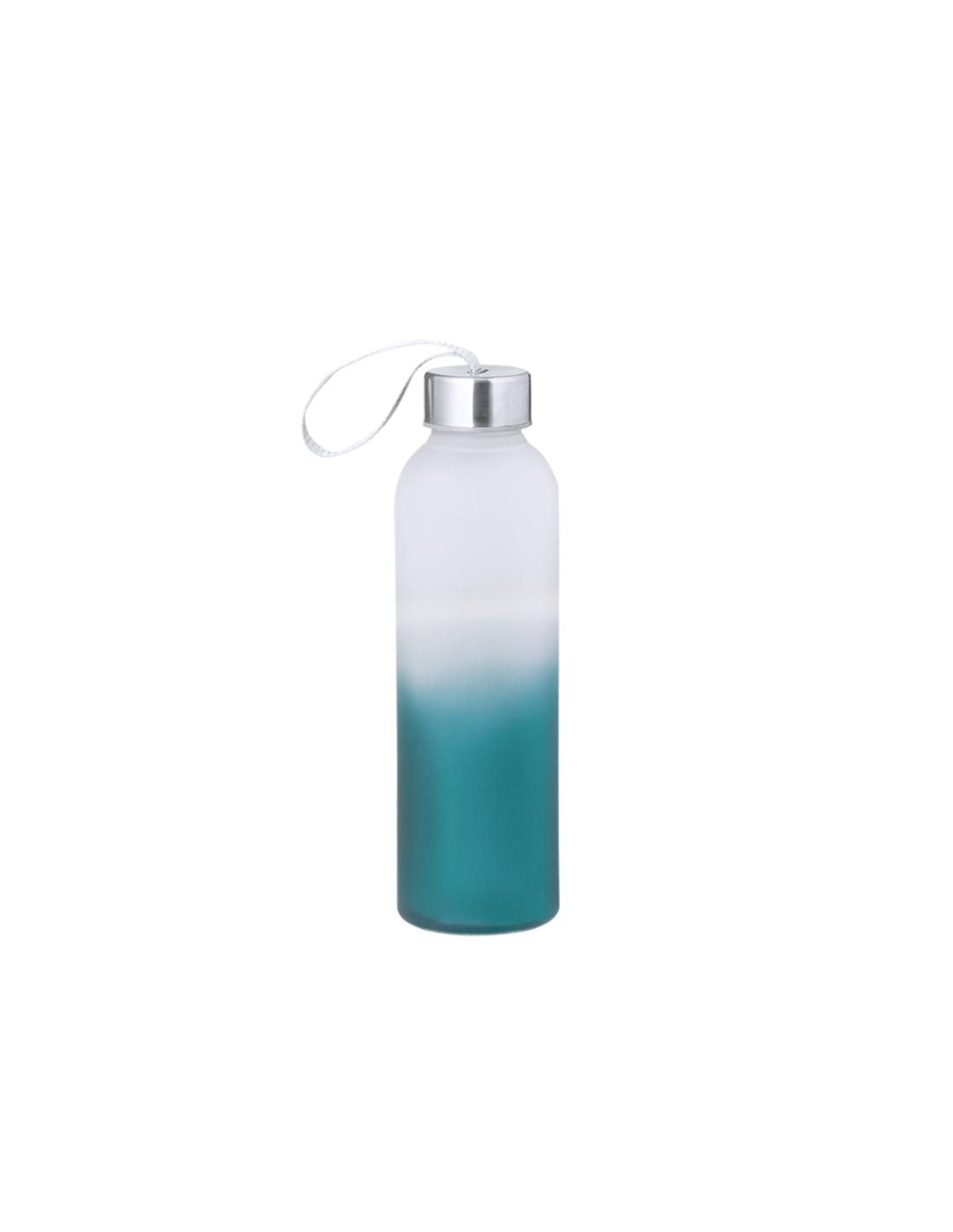 Bidón de cristal y acero inox con 500 ml de capacidad. Original diseño degradado de color blanco translúcido a diversos colores mate. Tapón de rosca con sellado perfecto con correa para su fácil transporte. Presentado individualmente en caja de diseño kraft.