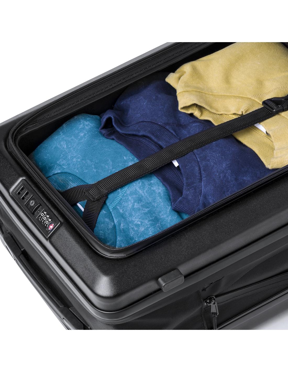 Práctico trolley plegable de 4 ruedas giratorias, en rígido ABS. Con la posibilidad de poder ampliar su capacidad por su parte central extensible, con cierre de cremallera de doble tirador. Equipado con un bolsillo acolchado para portátil de hasta 15 pulgadas y bolsillo para tablet de hasta 10 pulgadas, en la parte frontal. Cierre conforme a los estándares TSA -Administración de la Seguridad en el Transporte-, que permite a las autoridades de aduanas inspeccionar el contenido del equipaje sin tener que forzar o romper el cierre, a traves de una llave especial a disposición de la autoridad.