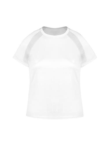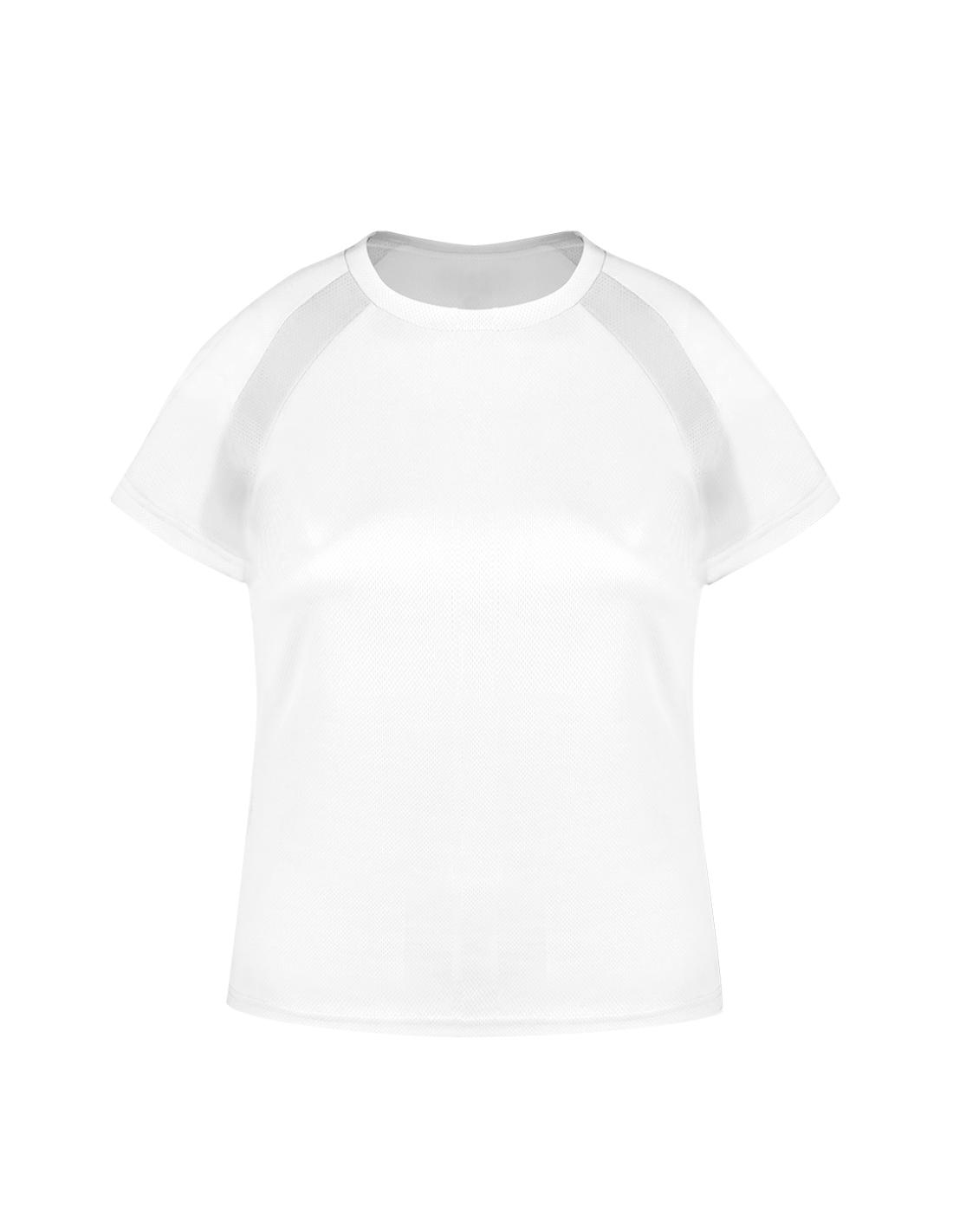 Camiseta técnica para mujer en material 100% poliéster transpirable de 135g/m2. Con manga ranglán, cuello redondo y con bandas frontales y laterales en tejido transpirable microperforado. Disponible en tallas S, M, L, XL.