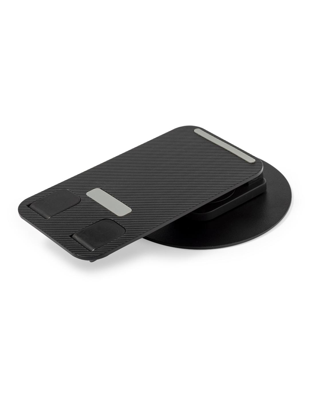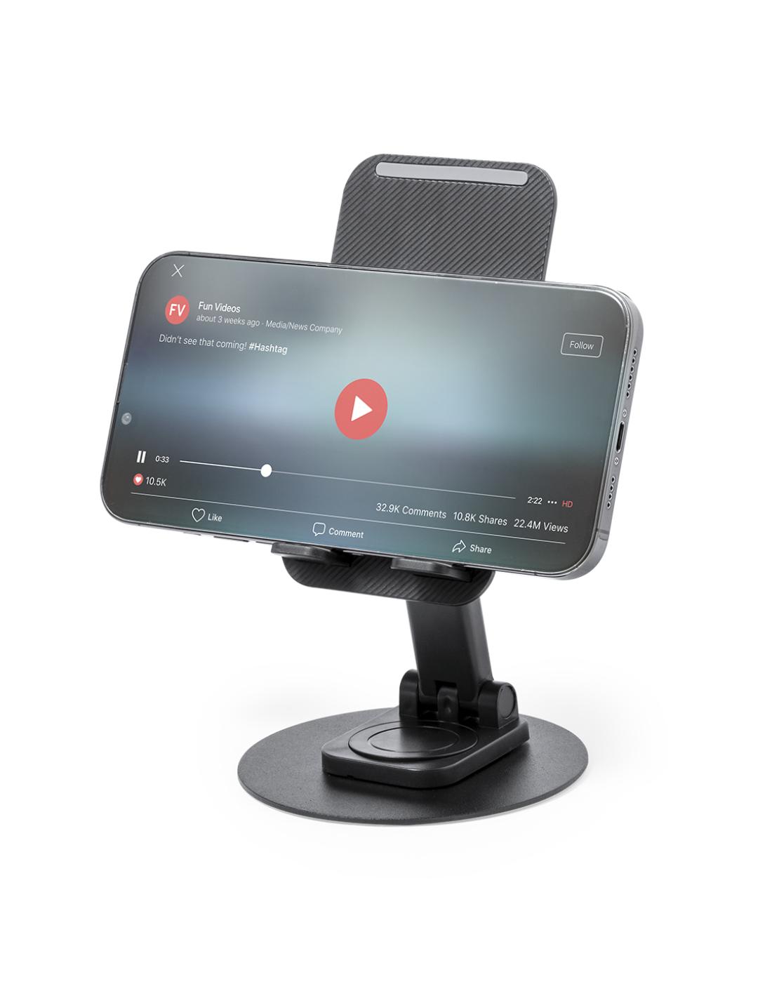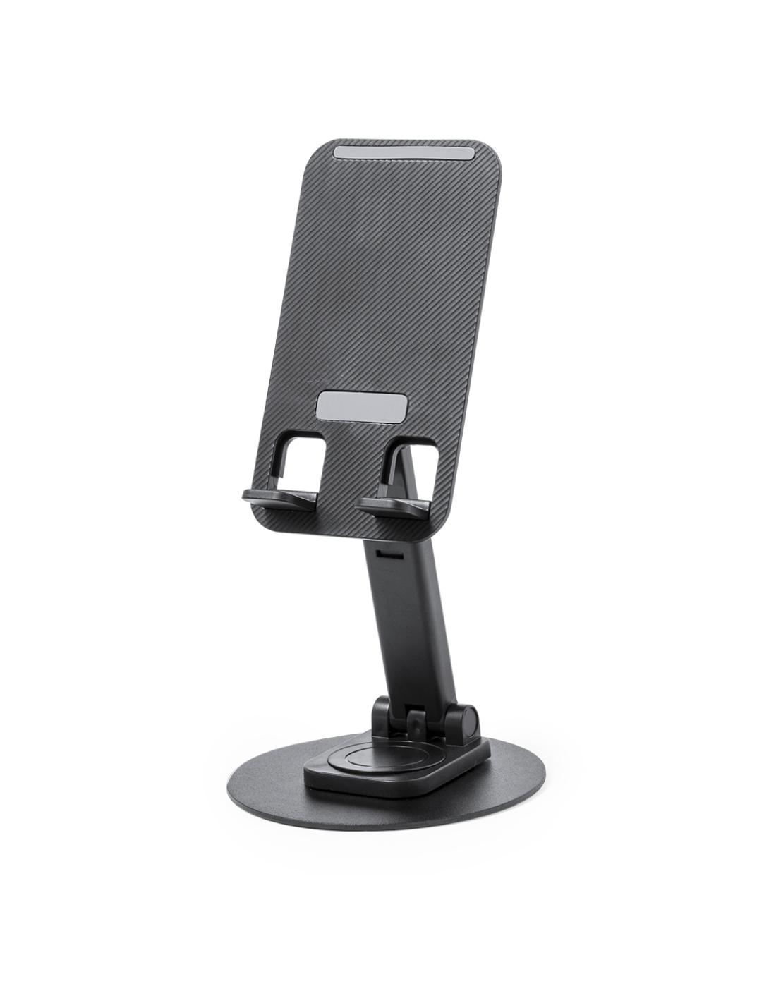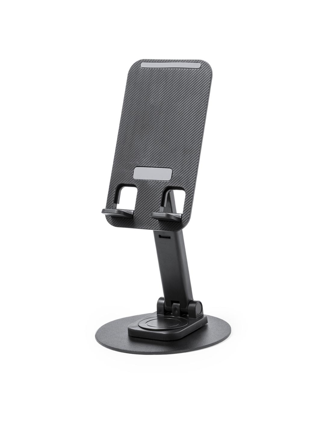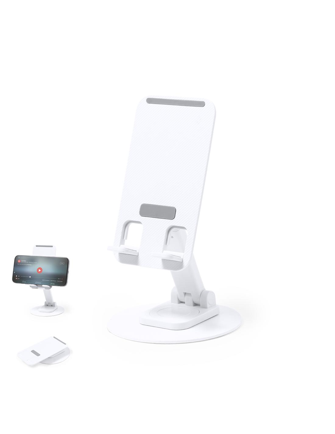 Soporte plegable para smartphone y tablet, fabricado en resistente aluminio y ABS. Regulable en altura, con almohadillas de goma antideslizantes en base y soporte. En sobrio acabado de color blanco o negro, y con amplia superficie de marcaje. Presentado en atractiva caja de diseño.