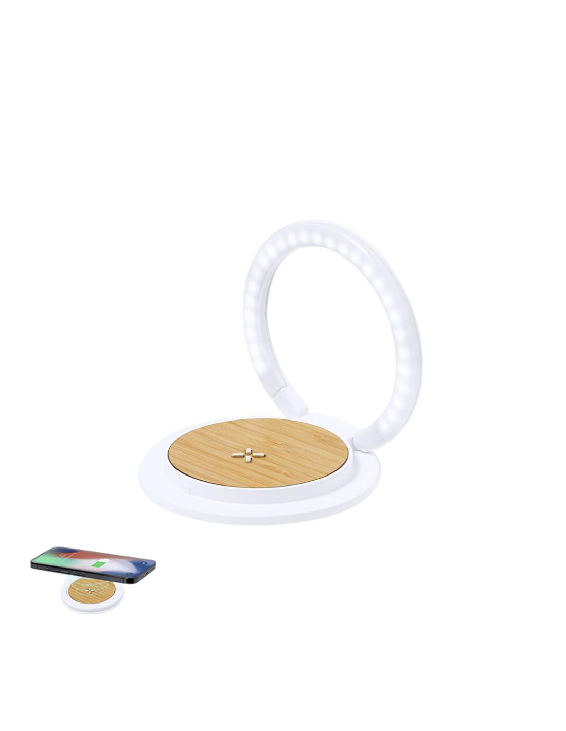 Lámpara multifunción fabricada en bambú. Con cargador inalámbrico de 15W integrado y 27 LEDs en un aro plegable que también hace de soporte. Compatible con dispositivos móviles de carga inalámbrica y con cable cargador Tipo C incluido, y presentada en una atractiva caja de diseño kraft. Disponible manual de instrucciones en español e inglés.Materiales como el bambú fomentan la utilización de materias primas naturales, reduciendo las emisiones contaminantes. Proviene de una planta de gran resistencia y versatilidad, con crecimiento y regeneración rápidos, siendo una excelente alternativa al uso de madera tradicional.Fabricada conforme a los estándares RoHS y en cumplimiento con los siguientes requisitos de seguridad:Sistema de protección contra sobrecalentamiento.Sistema de protección contra sobrecarga.Sistema...