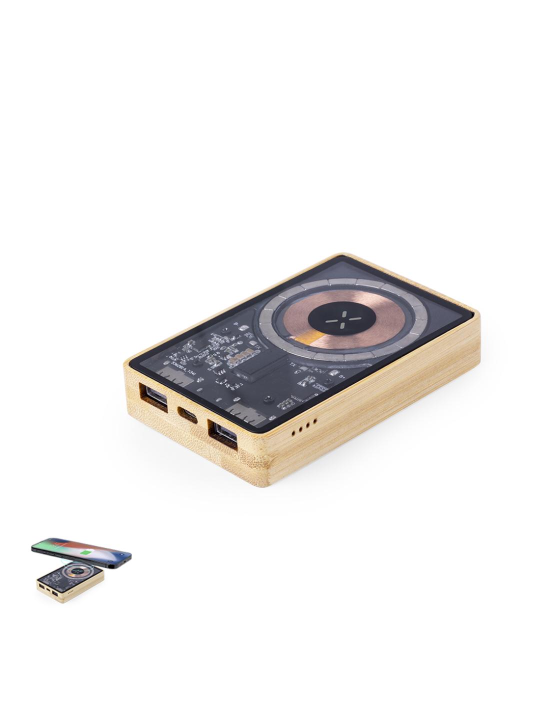 Batería auxiliar externa de original diseño y superficie transparente que permite ver los componentes internos del dispositivo. 5.000 mAh de capacidad de carga, con base en bambú y cargador inalámbrico integrado 15W. Conexiones de entrada/salida Tipo C + salida USB. Fijación magnética Magsafe y compatible con dispositivos equipados con tecnología de carga inalámbrica Qi. Cable de carga incluido, con manual de instrucciones en español e inglés. Presentada en caja individual de diseño eco y en cartón kraft.Entrada/Salida Tipo C: 5-12V DC 3-1.67A, 20WSalida USB: 5-12V DC 3-1.5A, 18WLas capacidades mostradas en todas nuestras baterías auxiliares externas son reales, incorporando todas ellas baterías de grado A y no recicladas, con una vida útil de al menos 500 ciclos de carga y según normativa CE. Además...