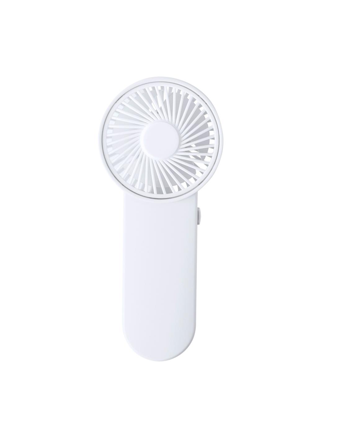 Ventilador de mano en resistente ABS. Con botón lateral de on/off y disponible en variada gama de vivos colores. Alimentación a pilas -2xAA no incluidas. Presentado individualmente en caja.