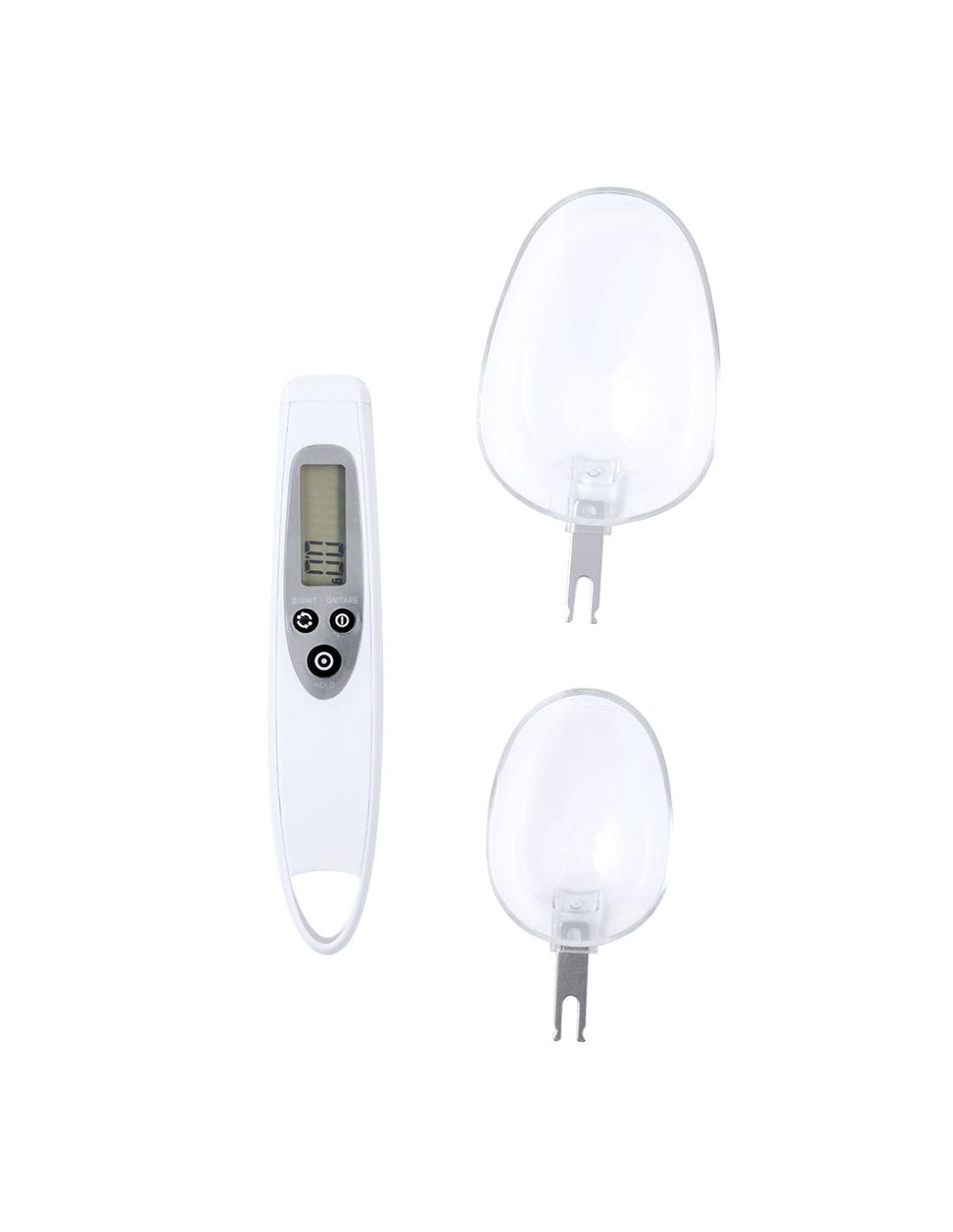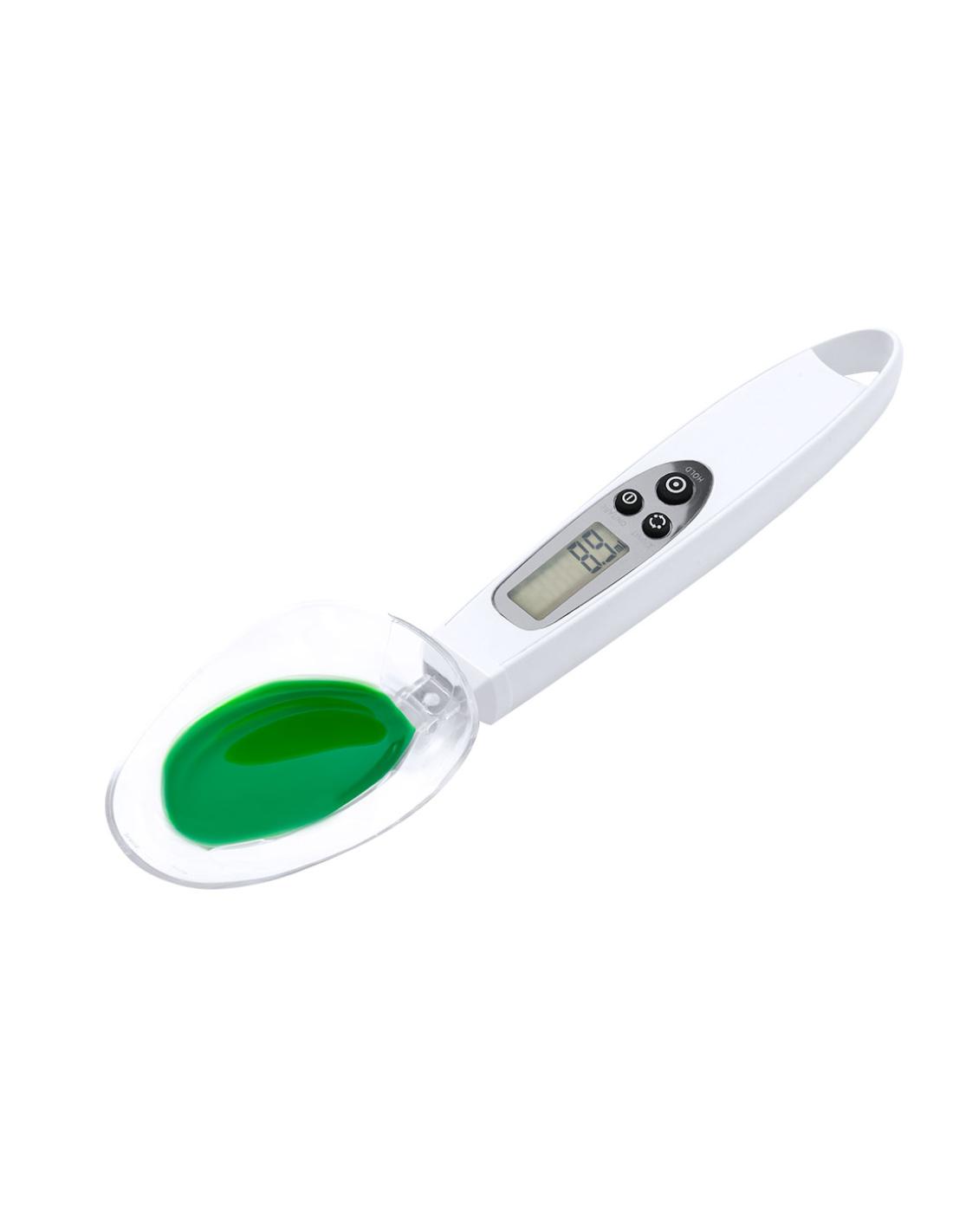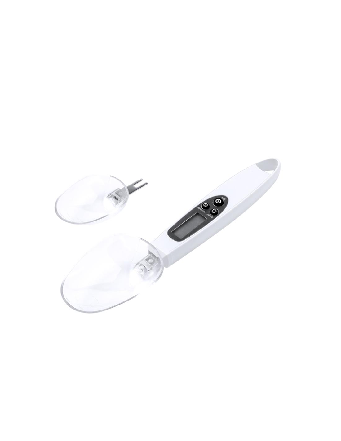 Práctica báscula digital con cuchara, válida para líquidos y sólidos. Incluye 2 cucharas intercambiables y pantalla digital LCD situada en el mango, mostrando el pesaje con una precisión de 0,1g. Botón para mostrar el peso en gramos (g), onzas (oz), o mililitros ( ml), con función de memoria y posibilidad de pesar dos ingredientes. Ambas cucharas llevan grabada una escala de medición adicional para líquidos: la cuchara pequeña desde 5 ml hasta 25 ml; y la cuchara grande desde 10 ml hasta 50 ml. Con manual de instrucciones en español e inglés. Alimentada por pila de botón (incluida) y presentada individualmente en caja de diseño kraft.