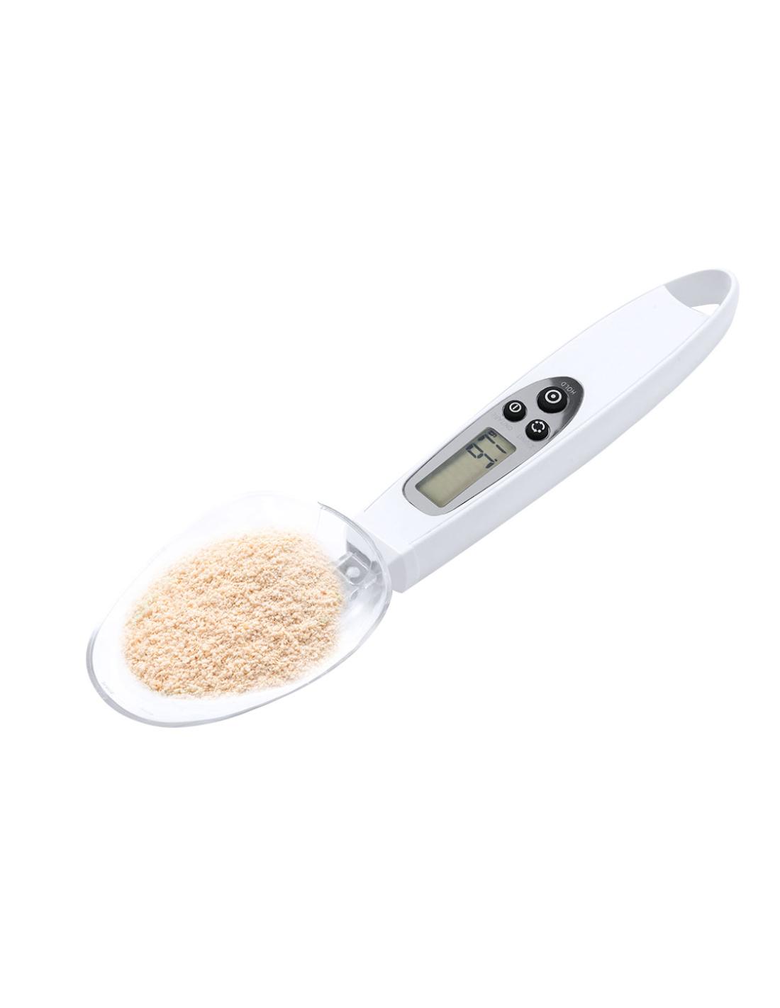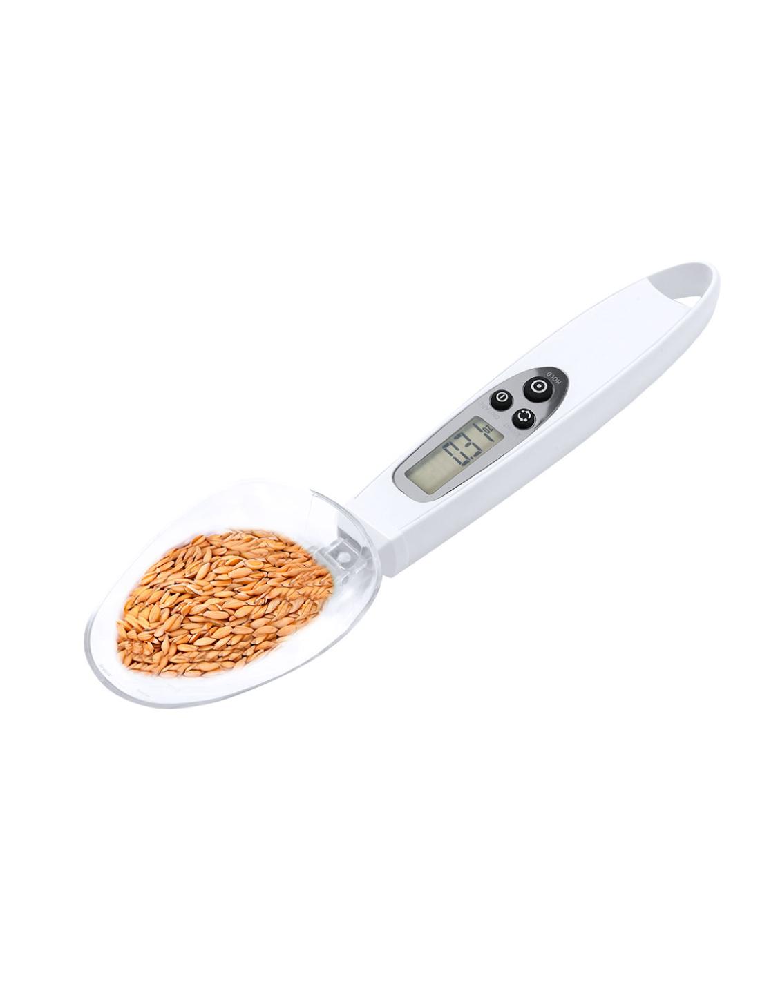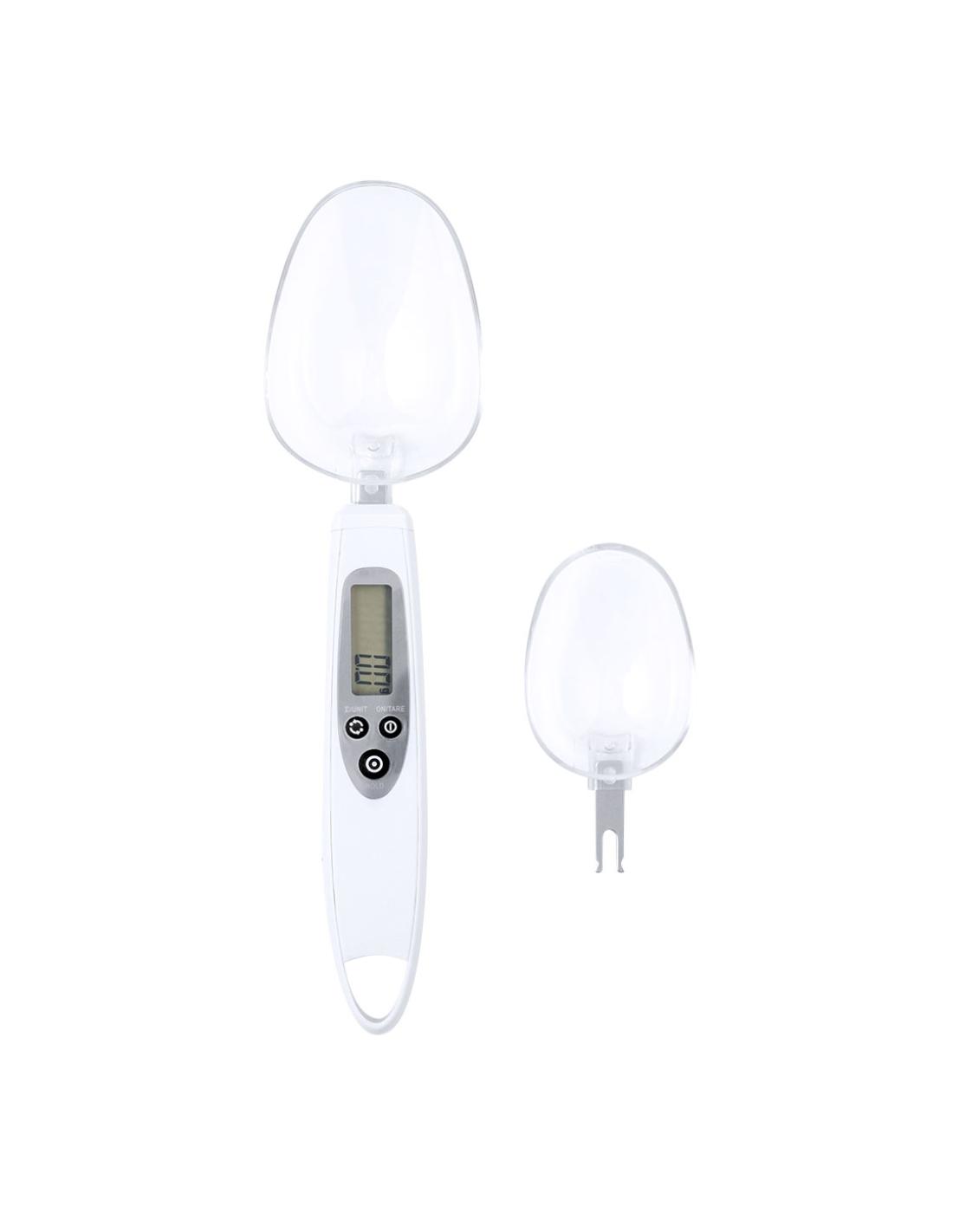 Práctica báscula digital con cuchara, válida para líquidos y sólidos. Incluye 2 cucharas intercambiables y pantalla digital LCD situada en el mango, mostrando el pesaje con una precisión de 0,1g. Botón para mostrar el peso en gramos (g), onzas (oz), o mililitros ( ml), con función de memoria y posibilidad de pesar dos ingredientes. Ambas cucharas llevan grabada una escala de medición adicional para líquidos: la cuchara pequeña desde 5 ml hasta 25 ml; y la cuchara grande desde 10 ml hasta 50 ml. Con manual de instrucciones en español e inglés. Alimentada por pila de botón (incluida) y presentada individualmente en caja de diseño kraft.