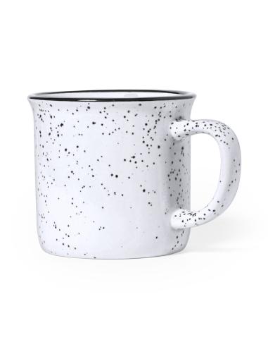 Taza de cerámica de 350ml de capacidad con diseño vintage. En combinación de exterior en colores moteados e interior a juego, con borde negro. Presentada en caja individual acabado kraft.