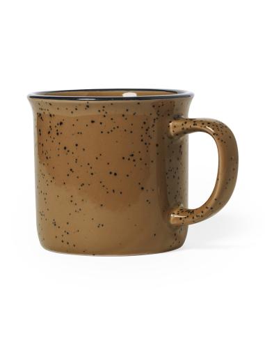 Taza de cerámica de 350ml de capacidad con diseño vintage. En combinación de exterior en colores moteados e interior a juego, con borde negro. Presentada en caja individual acabado kraft.