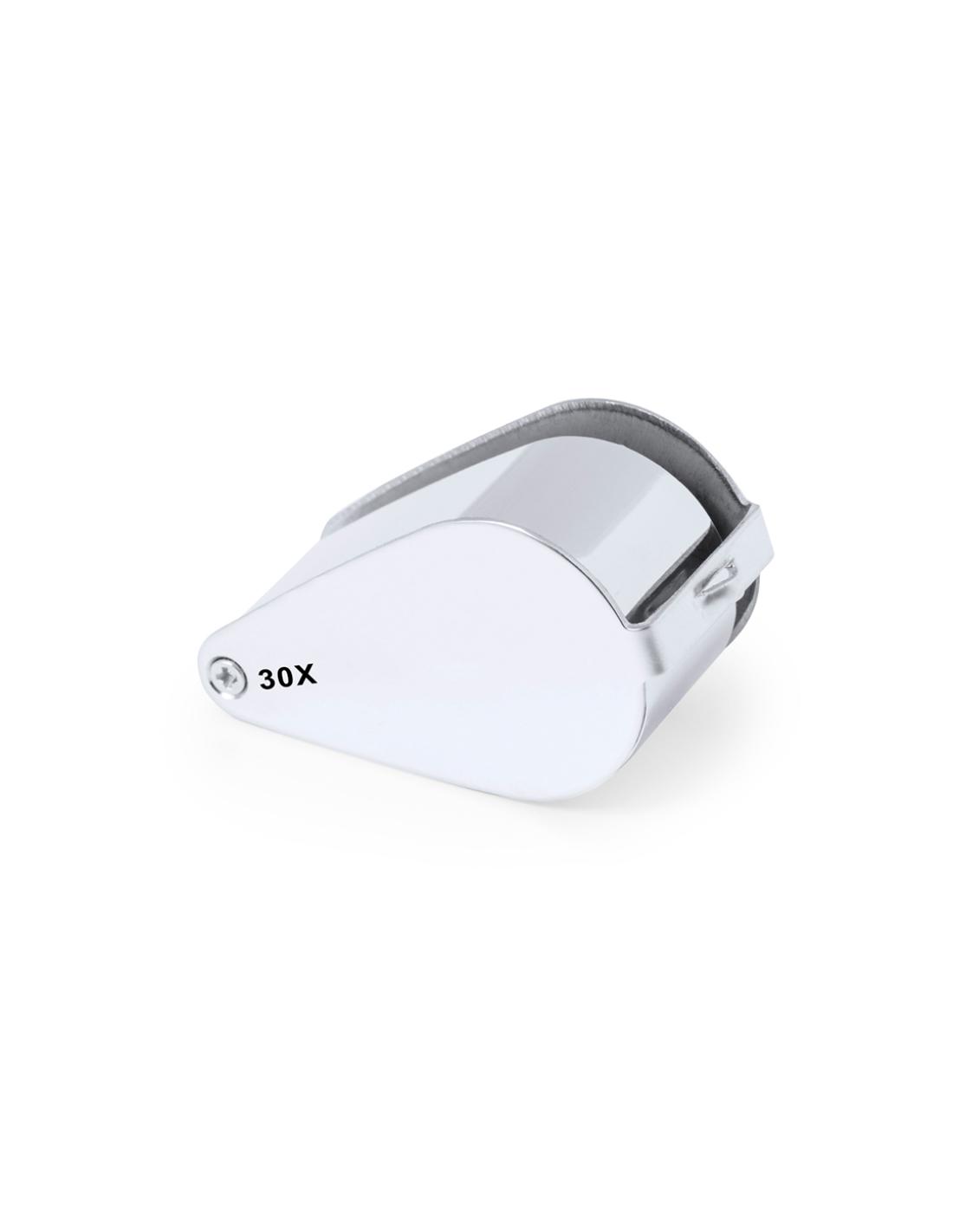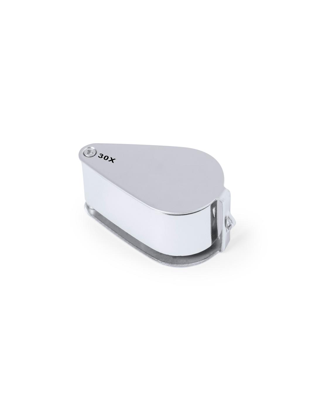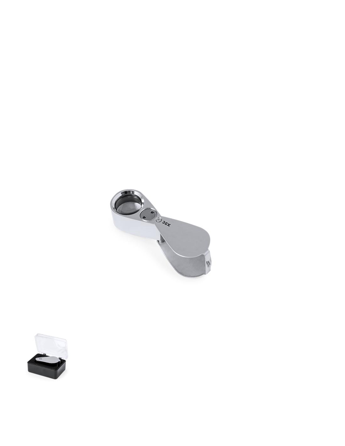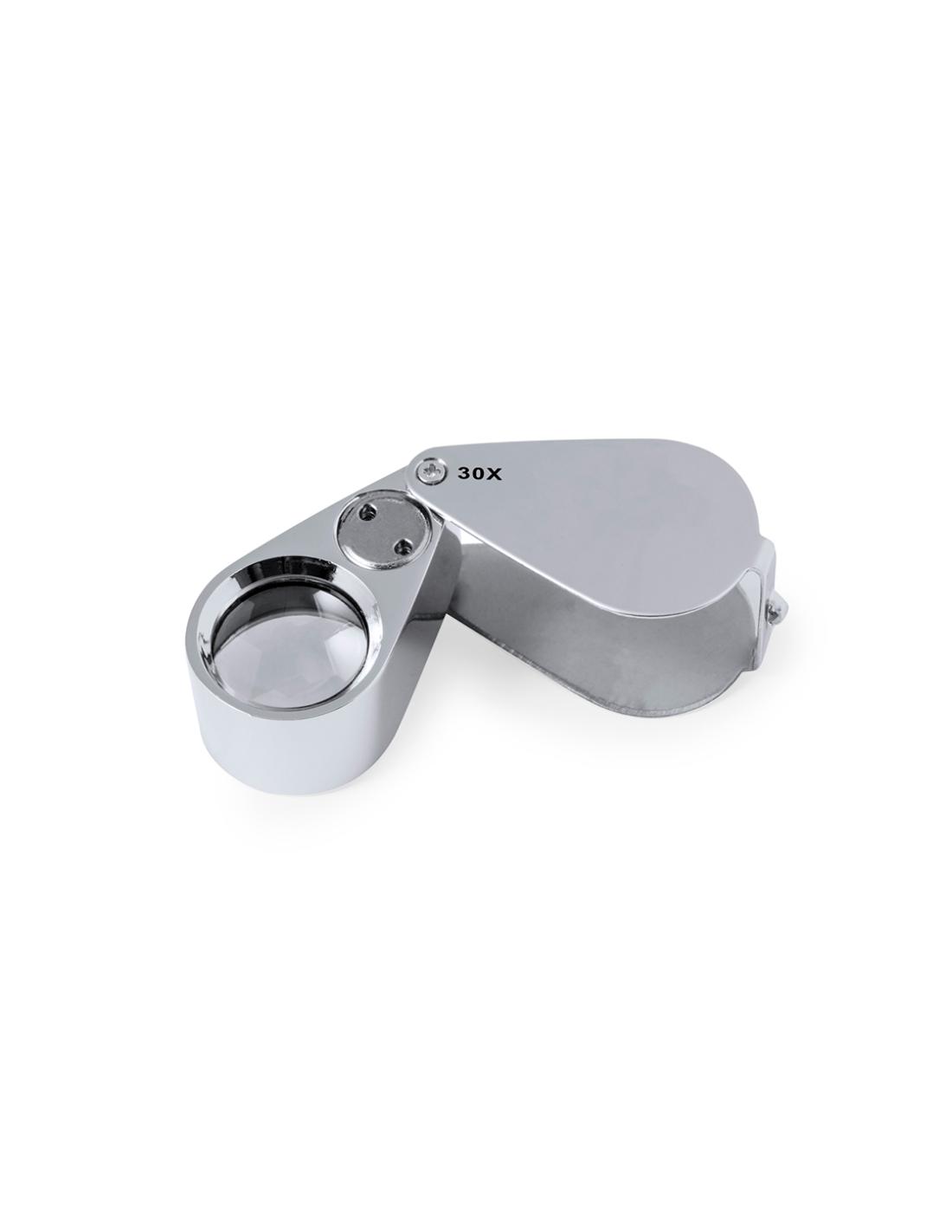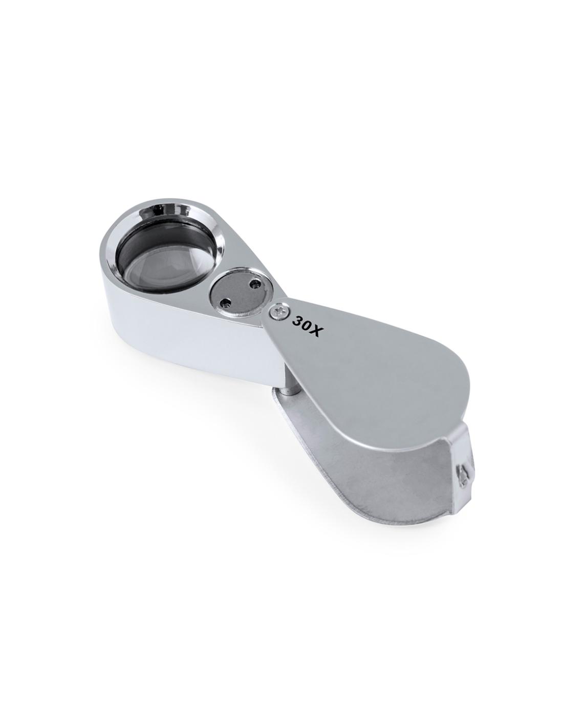 Lupa plegable con aumento 30x fabricada en resistente metal. Con luces LED integradas y gran potencia de aumento para obtener una visión muy cercana de los detalles más pequeños, con ampliación sin distorsión. Ideal para inspeccionar objetos de tamaño reducido, textos, etc. Además, tiene un accesorio para colgar, y viene dentro de un estuche con interior acolchado para una mayor protección. Alimentación a pilas (de botón incluidas), con llave especial para reemplazarlas cuando se agoten. Presentada en caja de cartón negra.