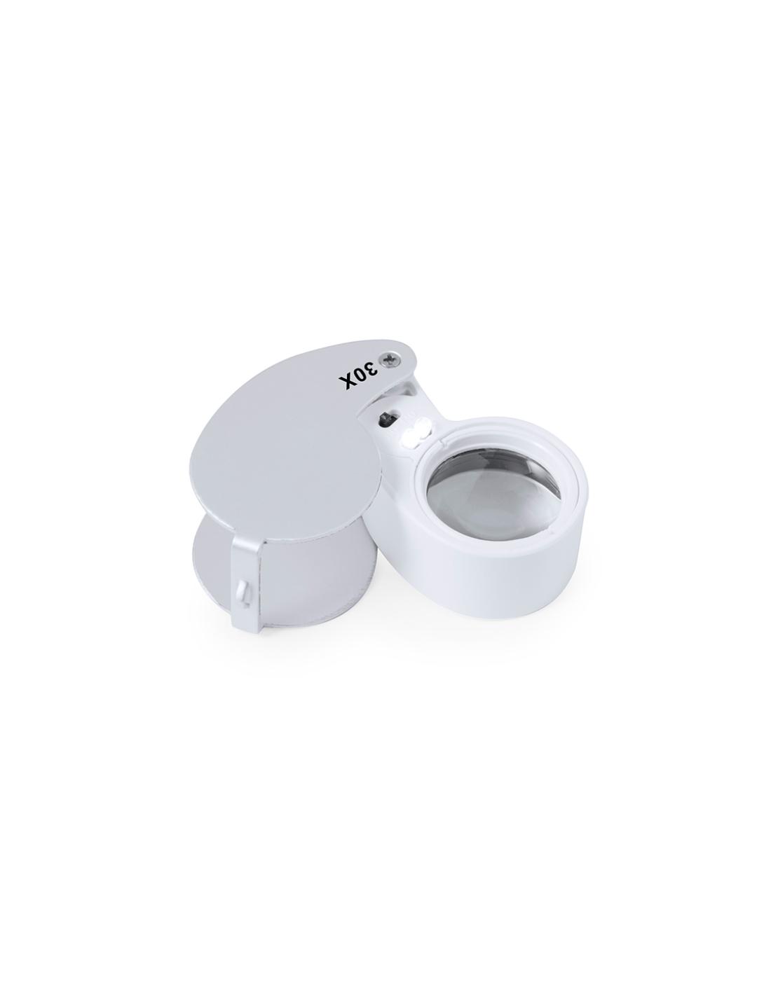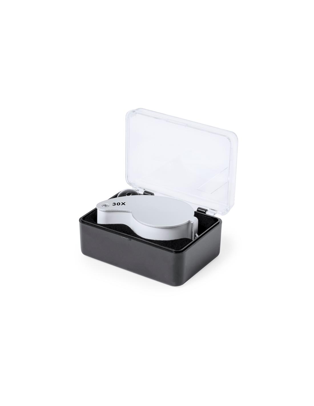 Lupa plegable doble con aumento 30x , fabricada en resistente metal. Con luces LED integradas y gran potencia de aumento para obtener una visión muy cercana de los detalles más pequeños y ampliación sin distorsión. Ideal para inspeccionar objetos de tamaño reducido, textos, etc. Además, tiene un accesorio para colgar, y viene dentro de un estuche con interior acolchado para una mayor protección. Alimentación a pilas (de botón incluidas), con llave especial para reemplazarlas cuando se agoten. Presentada en caja de cartón negra.