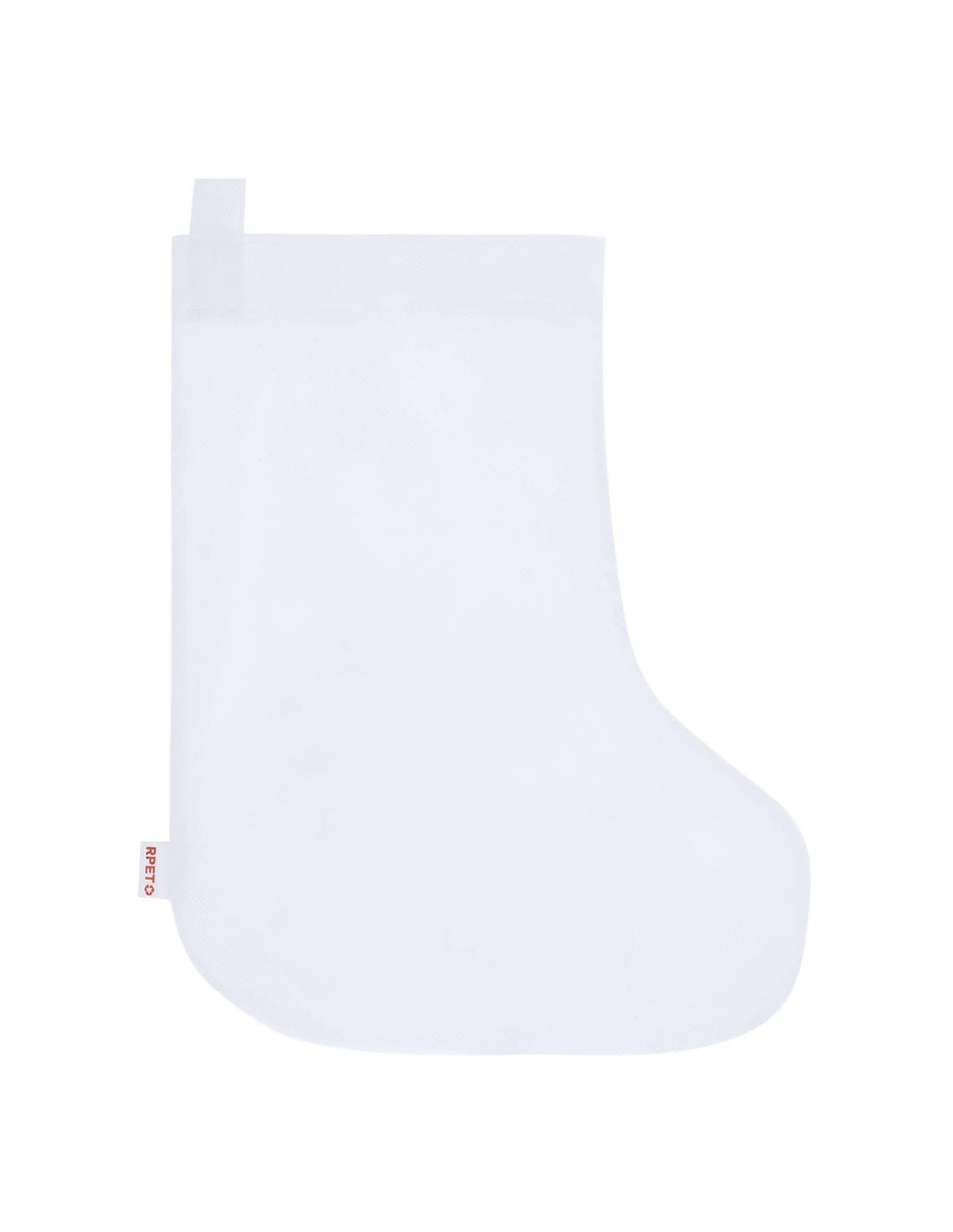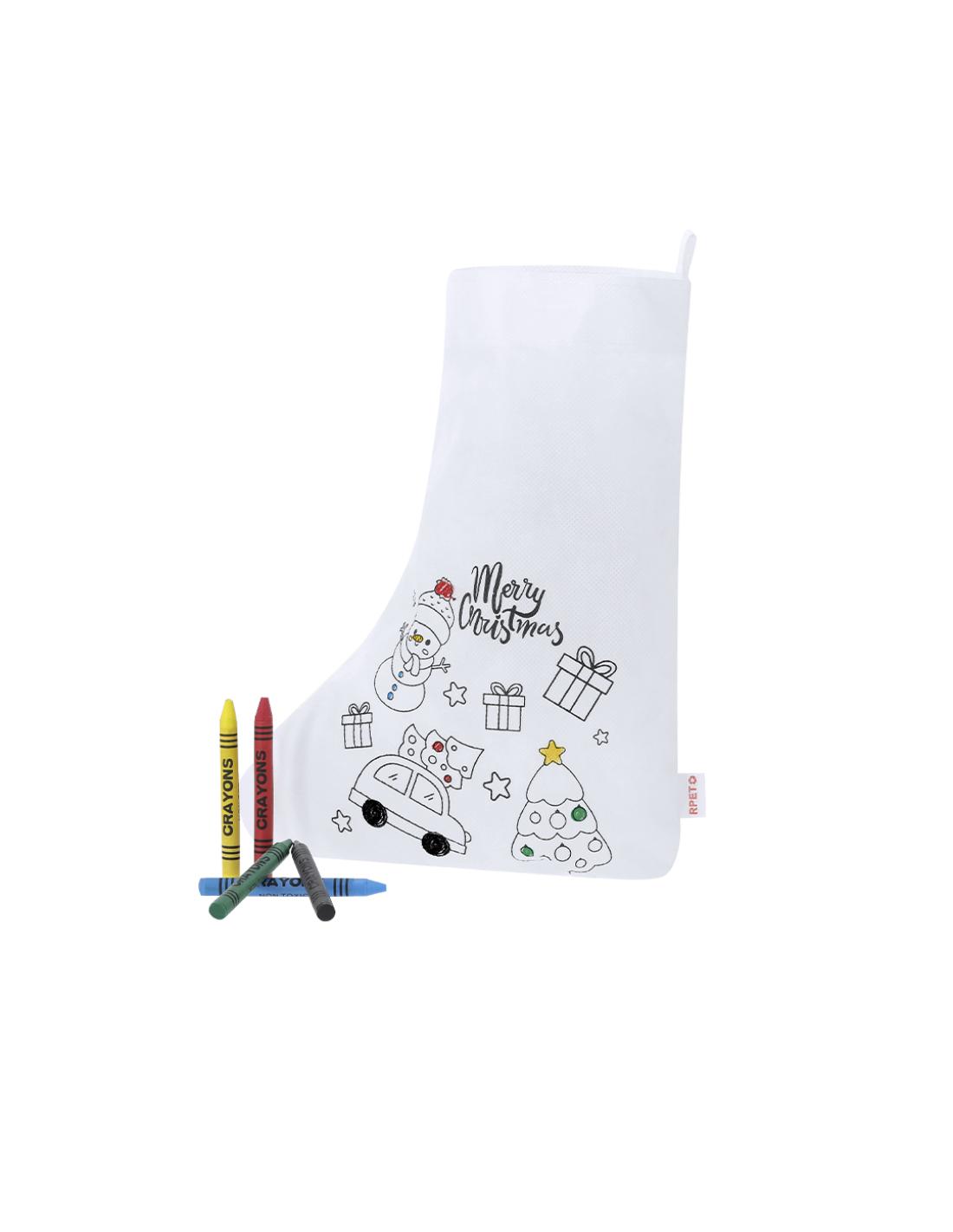 Calcetín de non-woven RPET en color blanco, especialmente diseñado para colorear con ceras. Diseño frontal de divertidos dibujos navideños, incluyendo 5 ceras en variados colores. Con cinta para colgar y de acabado termosellado. Incluye distintivo RPET en etiqueta.El material RPET se elabora a partir de plástico reciclado, para así fomentar la reutilización de residuos plásticos y ayudar a la sostenibilidad del planeta.