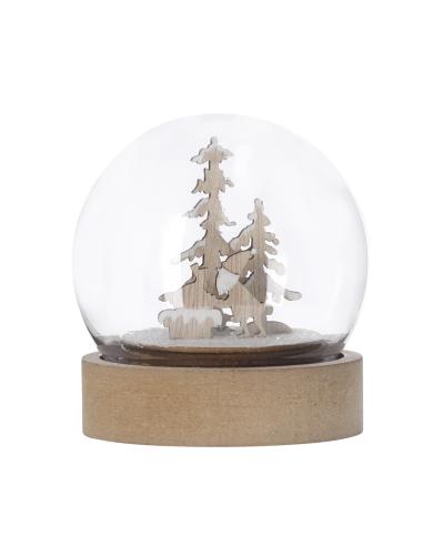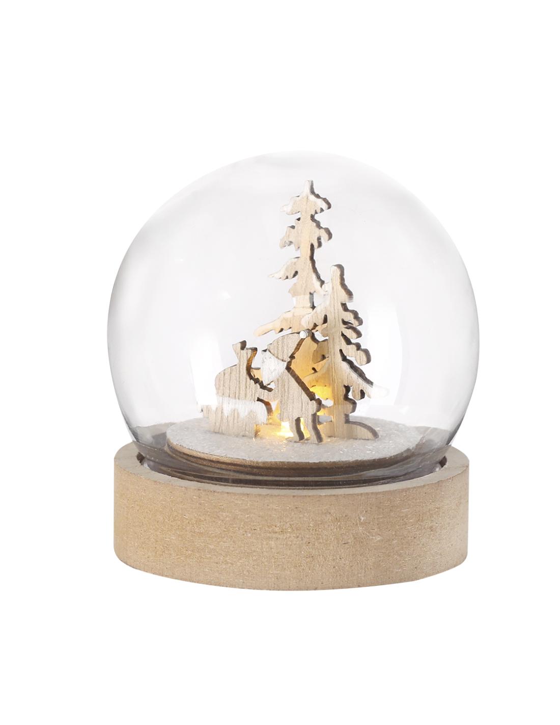 Bola iluminada con original diseño navideño. Elaborada en resistente material acrílico, con base de madera lisa para impresión. Dispone de iluminación interior con 1 LED en tono blanco. Alimentación por 3 pilas de botón, incluidas, con botón ON/OFF en la base. Elaborado con elementos vegetales para así fomentar la utilización de materias primas naturales y reducir las emisiones contaminantes.