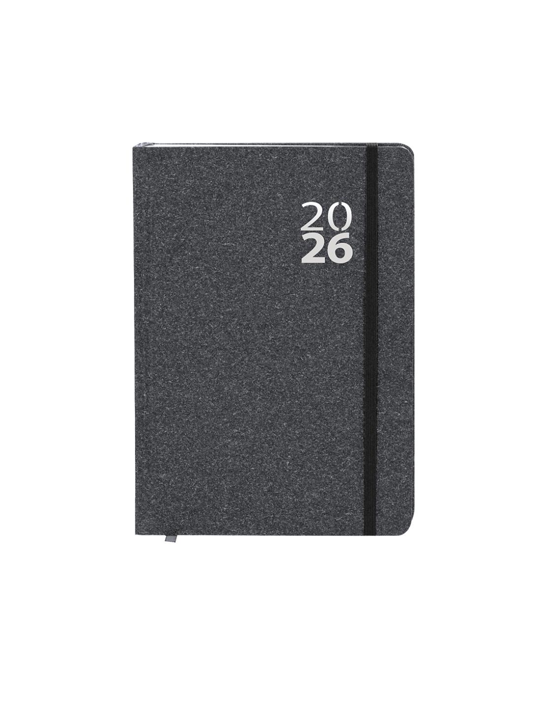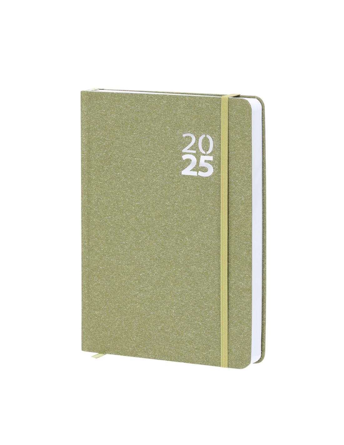 Agenda de tamaño A5 en Cartón Reciclado. Con cubiertas rígidas y elástico de cierre a juego. Incluye caja kraft de presentación. Con distintitivo ECO.Diseño página día, zona de anotaciones y marcapáginas de tela. En 2 idiomas: castellano e inglés. El Cartón Reciclado proviene del reaprovechamiento de excedente de fabricaciones y reciclaje de papel en el final de su vida útil, convirtiéndose en un lienzo ecológico y sostenible.