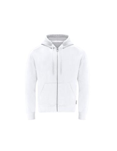 Sudadera Unisex con capucha y cremallera de Algodón Orgánico y Poliéster Reciclado, en suave felpa perchada de 280 g/m2. Con capucha forrada de doble capa, cordones redondos ajustables -con topes a juego- y ojales metálicos. Puños y cintura de punto canalé de elastano y bolsillo frontal tipo canguro. Apertura de cremallera oculta metálica, con cubrecosturas reforzado en cuello. Incluye etiqueta distintiva eco.