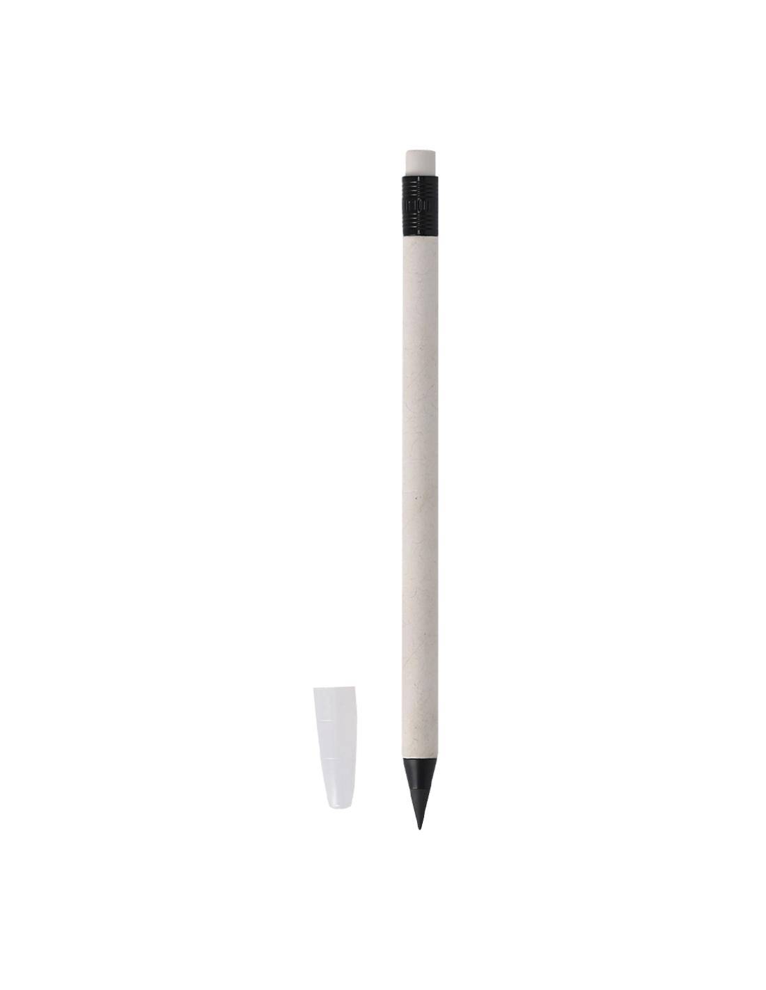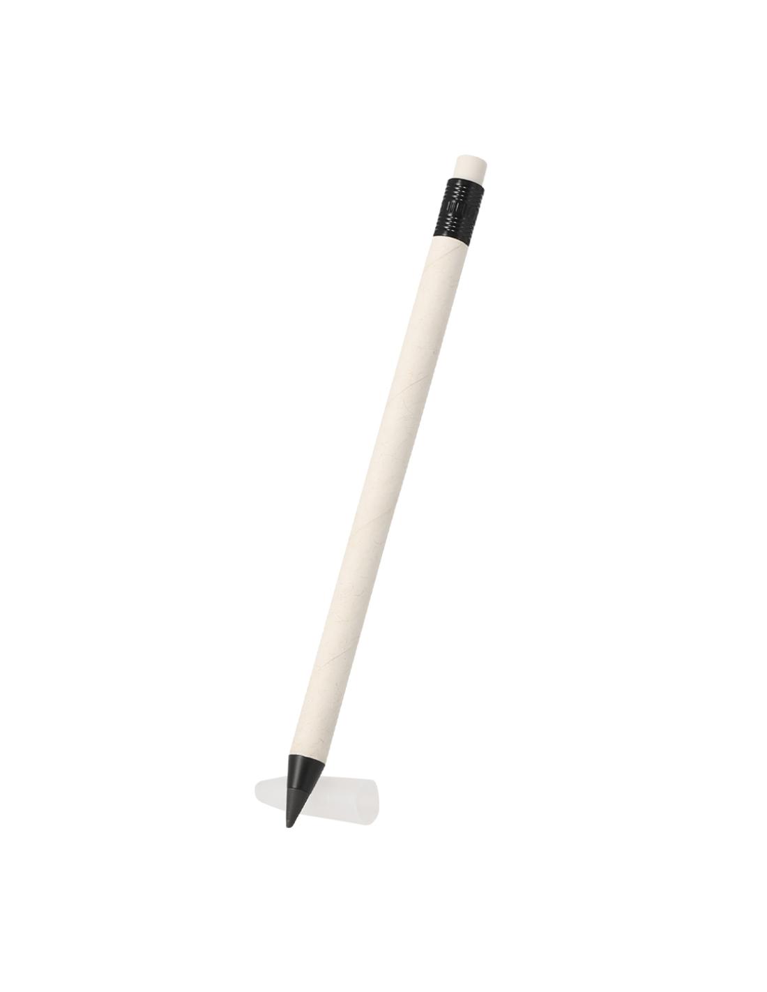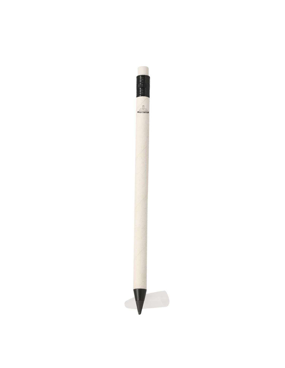 Lápiz eterno fabricado con cartones de leche reciclados. Reutilizable y con escritura infinita. Incluye goma de borrar en la parte superior del lápiz y capucha de protección. De color blanco, con detalles en negro. Con distintivo de cartón de leche reciclado en el cuerpo.Los cartones de leche se componen en su mayor parte de cartón y aluminio. Durante su proceso de reciclado, se separan los distintos materiales del envase para su reutilización y nuevo uso, contribuyendo así a recorrer el camino infinito de la economía circular. Este material se caracteriza por su alto grado de reciclabilidad, así como por su ligereza y resistencia.