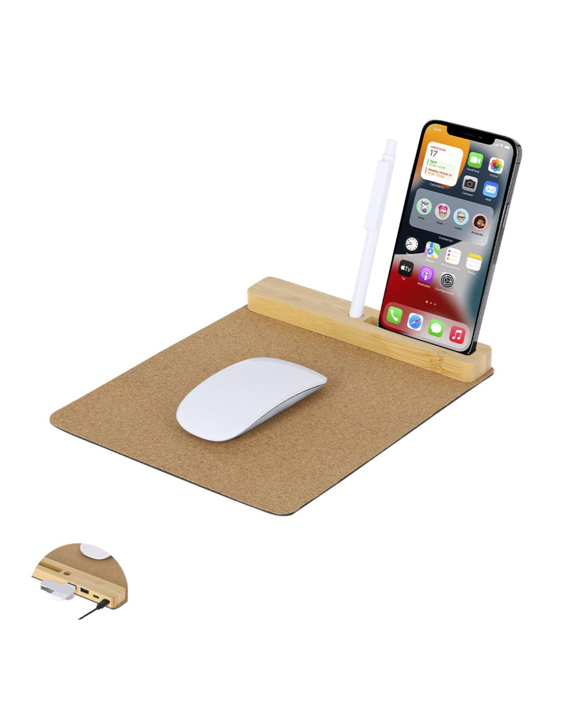 Alfombrilla multifunción fabricada en combinación de suave corcho y bambú. Flexible y con entrada Tipo C -cable incluido-, una salida Tipo C, y dos salidas USB; con función de sincronización de datos. Incluye soporte para smartphone y soporte para bolígrafos en la base de bambú. Es antideslizante y estable, garantizando una confortable experiencia de uso.Elaborado con elementos vegetales para así fomentar la utilización de materias primas naturales y reducir las emisiones contaminantes.Materiales como el bambú fomentan la utilización de materias primas naturales reduciendo las emisiones contaminantes. Además, el bambú proviene de una planta de gran resistencia y versatilidad, con crecimiento y regeneración rápida, siendo una excelente alternativa al uso de madera tradicional.