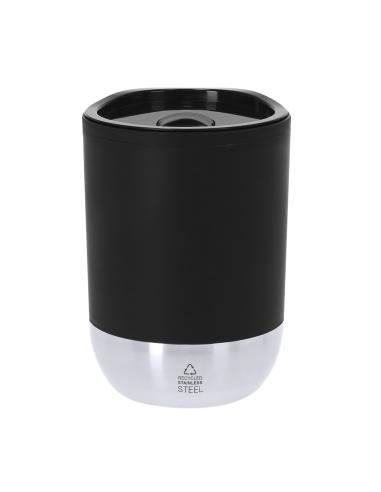 Vaso térmico de 290 ml de capacidad. Fabricado en resistente PP Reciclado de doble pared en combinación con base en Acero Inox Reciclado. Tapa con dosificador de fácil apertura, libre de BPA. Es ideal para tener en tu escritorio, mesa o en cualquier superficie donde disfrutar tranquilamente de tu bebida favorita. Con certificación Food Grade, garantizando la seguridad cuando los alimentos entran en contacto con el material usado para fabricar el producto. Con distintivo de Acero Inox Reciclado. El PP reciclado es un plástico reciclado y altamente reciclable, de gran resistencia y apto para multitud de aplicaciones.El acero es uno de los materiales más demandados y que puede encontrarse casi en todas partes, desde productos de uso diario a grandes construcciones. Con innumerables propiedades, entre las...