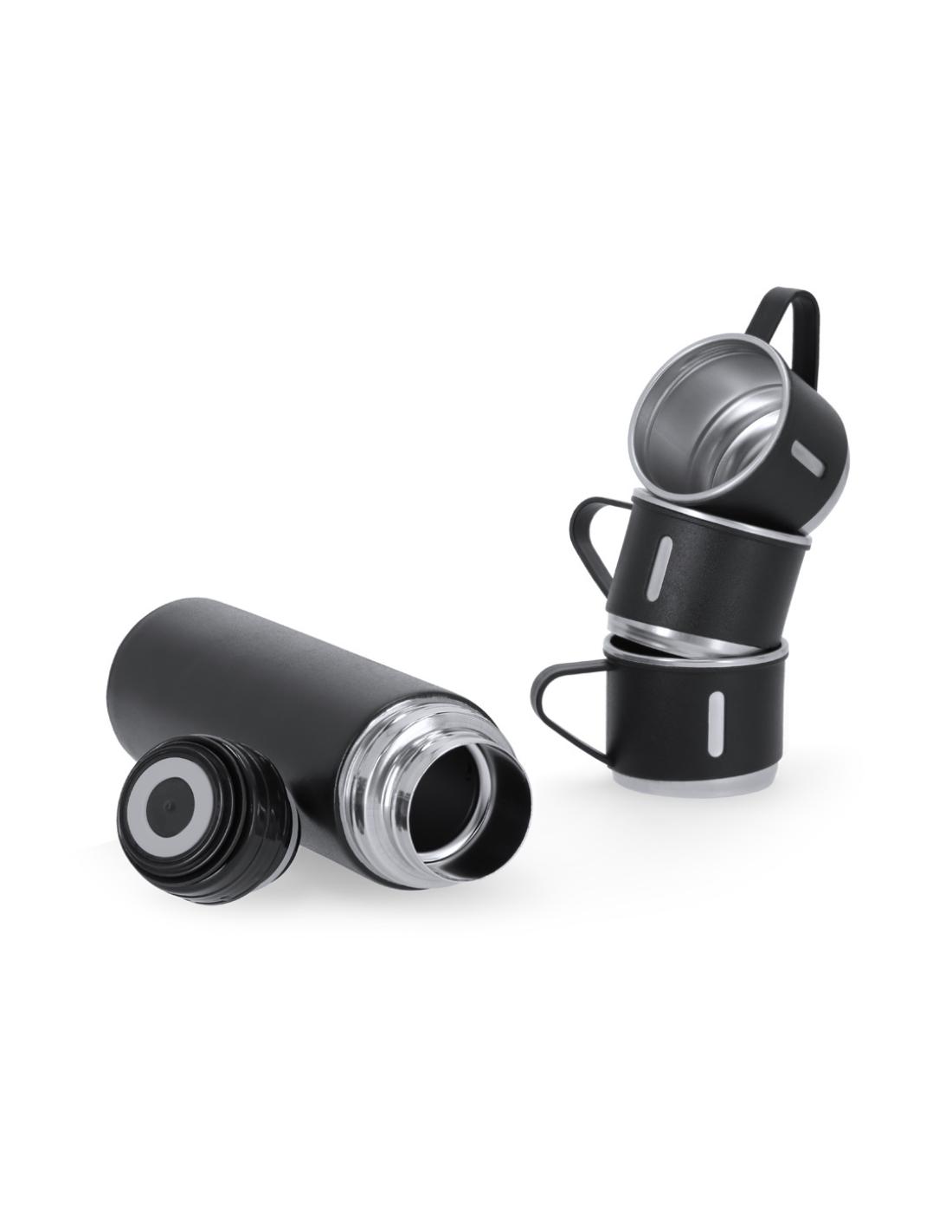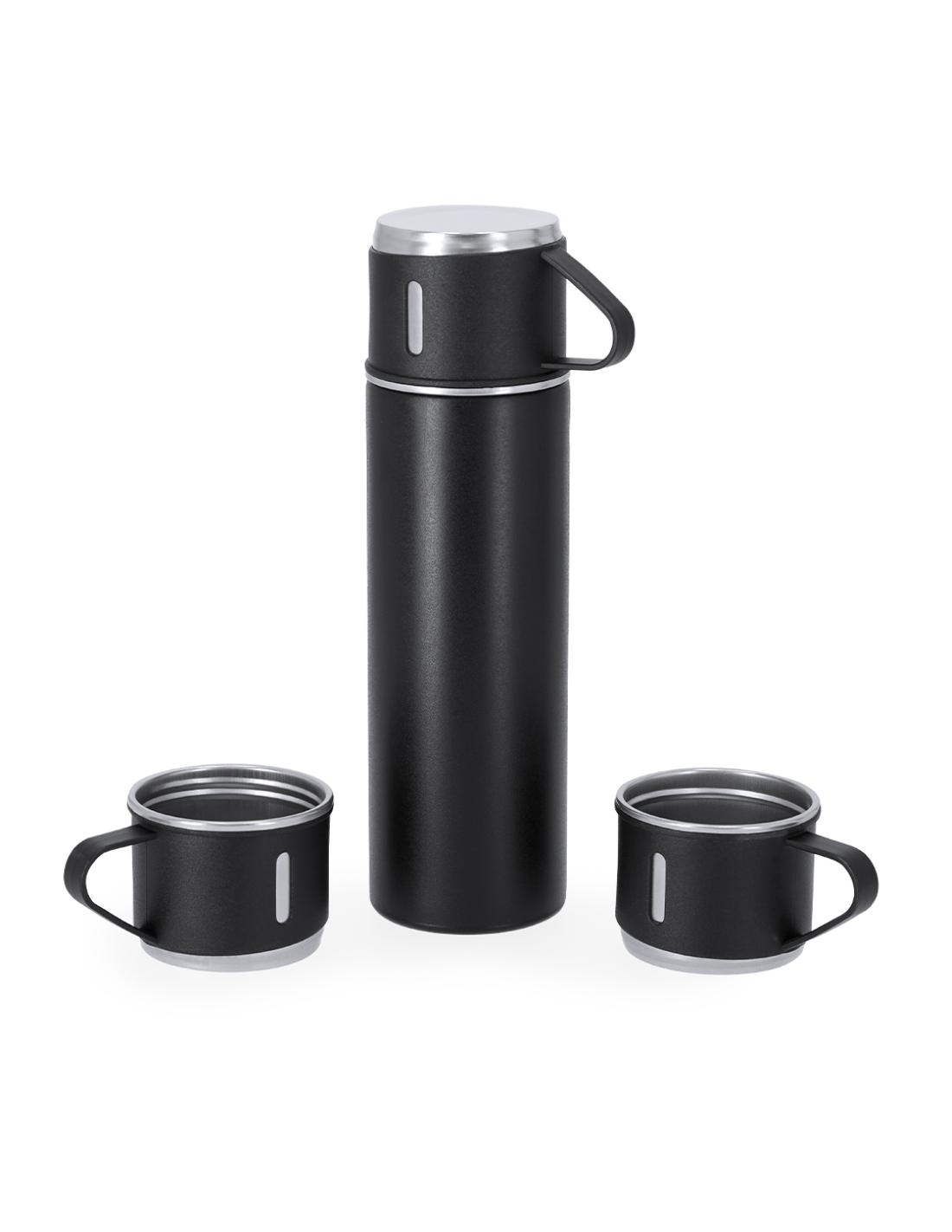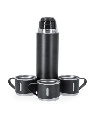 Set de termo con 3 tazas fabricado en acero inox. Termo de 420 ml de capacidad y de doble pared, que garantiza una mejor y más duradera conservación de la temperatura, con dosificador de seguridad. Tazas de 140ml, ajustables mediante rosca y en elegante diseño negro, ideales para disfrutar de la bebida, ya sea caliente o fría, en cualquier momento y lugar. Presentación en elegante estuche de color negro.