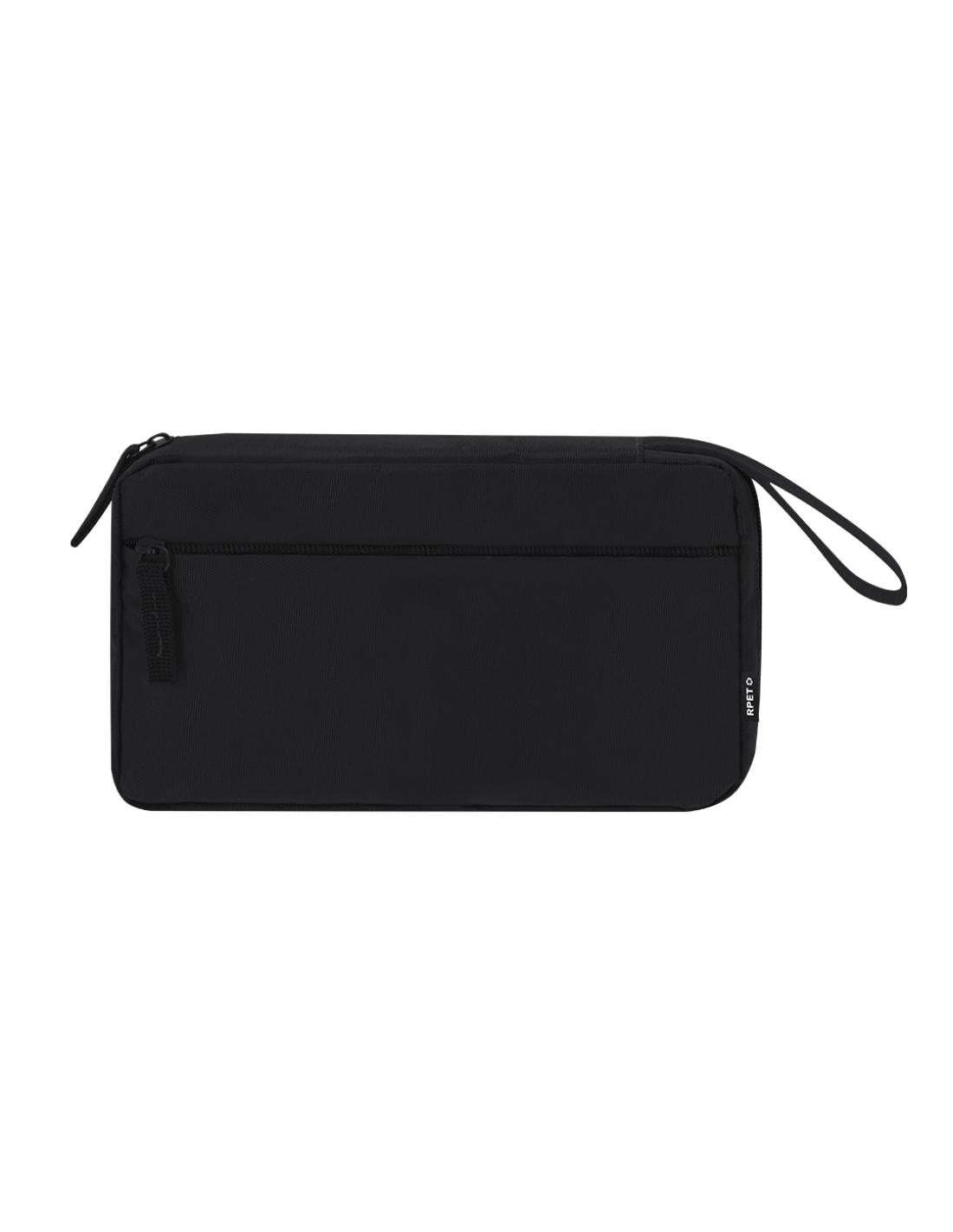 Estuche organizador fabricado en RPET 900D. Incluye bolsillo principal de apertura completa con doble tirador metálico y múltiples bolsillos interiores ideales para guardar cables: 3 bolsillos con banda elástica y 1 con cierre de cremallera. Además, incorpora un bolsillo exterior con cierre de cremallera invisible y asa para un cómodo transporte. Con distintivo RPET.El material RPET se elabora a partir de plástico reciclado, para así fomentar la reutilización de residuos plásticos y ayudar a la sostenibilidad del planeta.