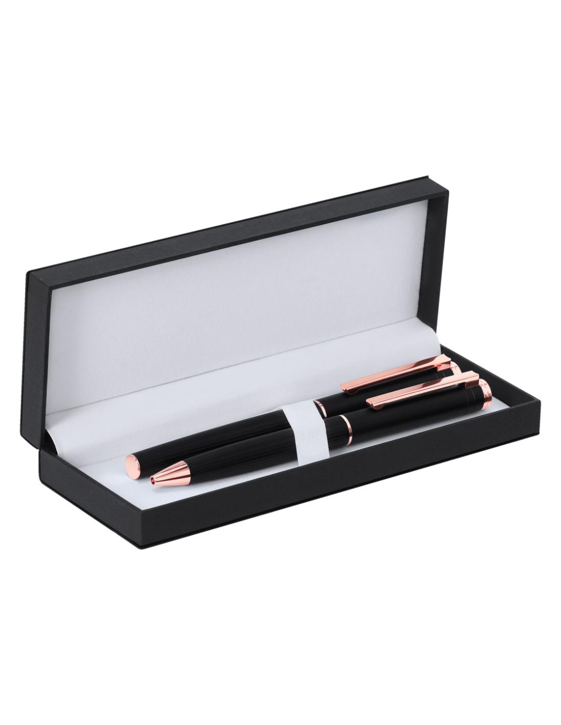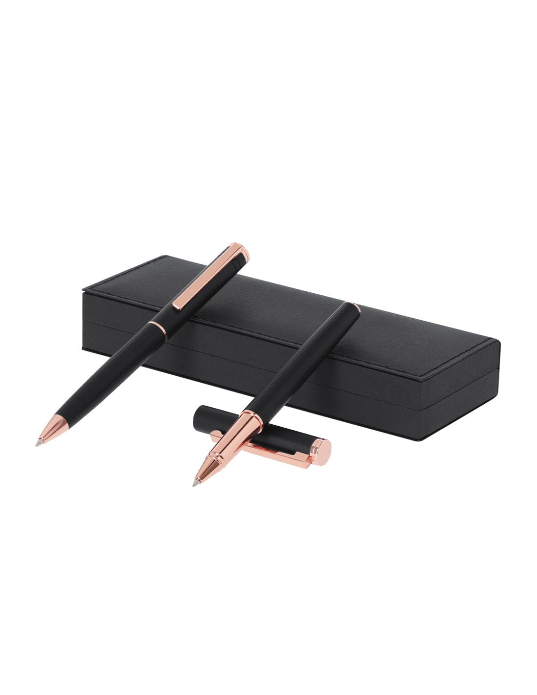 Distinguido set de bolígrafo y roller, con cuerpos diseñados en elegante aluminio de acabado negro mate y detalles decorativos en oro rosado. Ambos presentan una estilizada caña y clip metálico. El bolígrafo cuenta con un mecanismo giratorio. El roller incluye capucha. Ambos con tinta azul y cartucho jumbo. Presentados en un sofisticado estuche negro con tacto de piel e interior blanco.