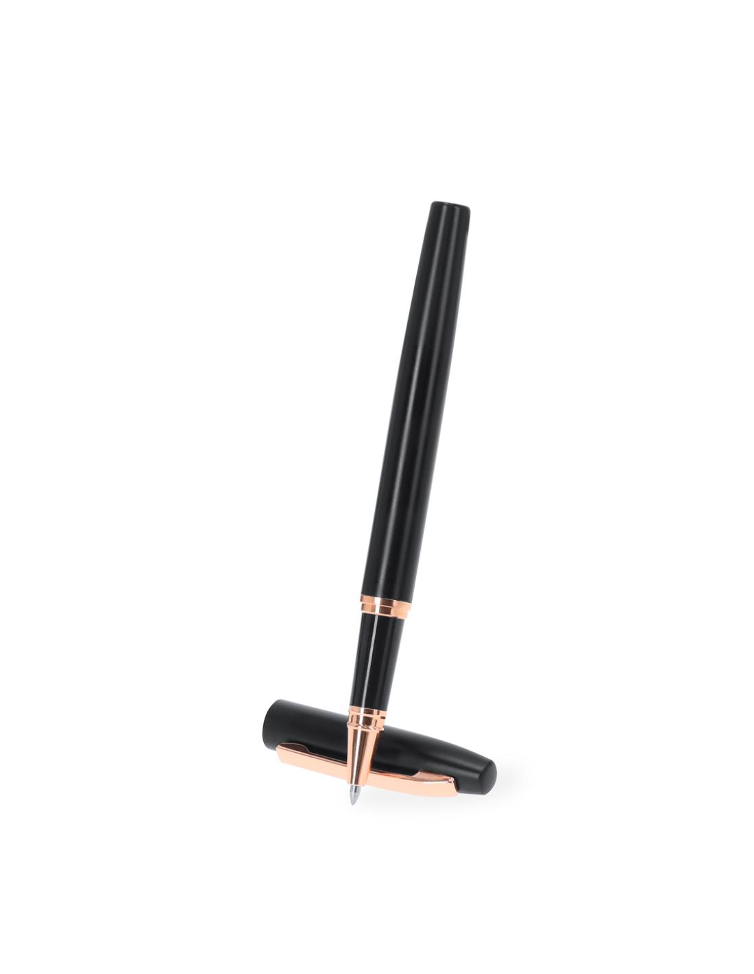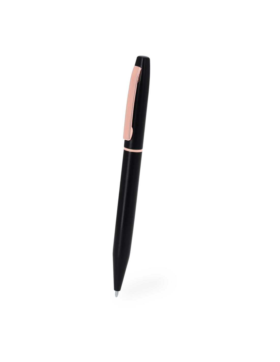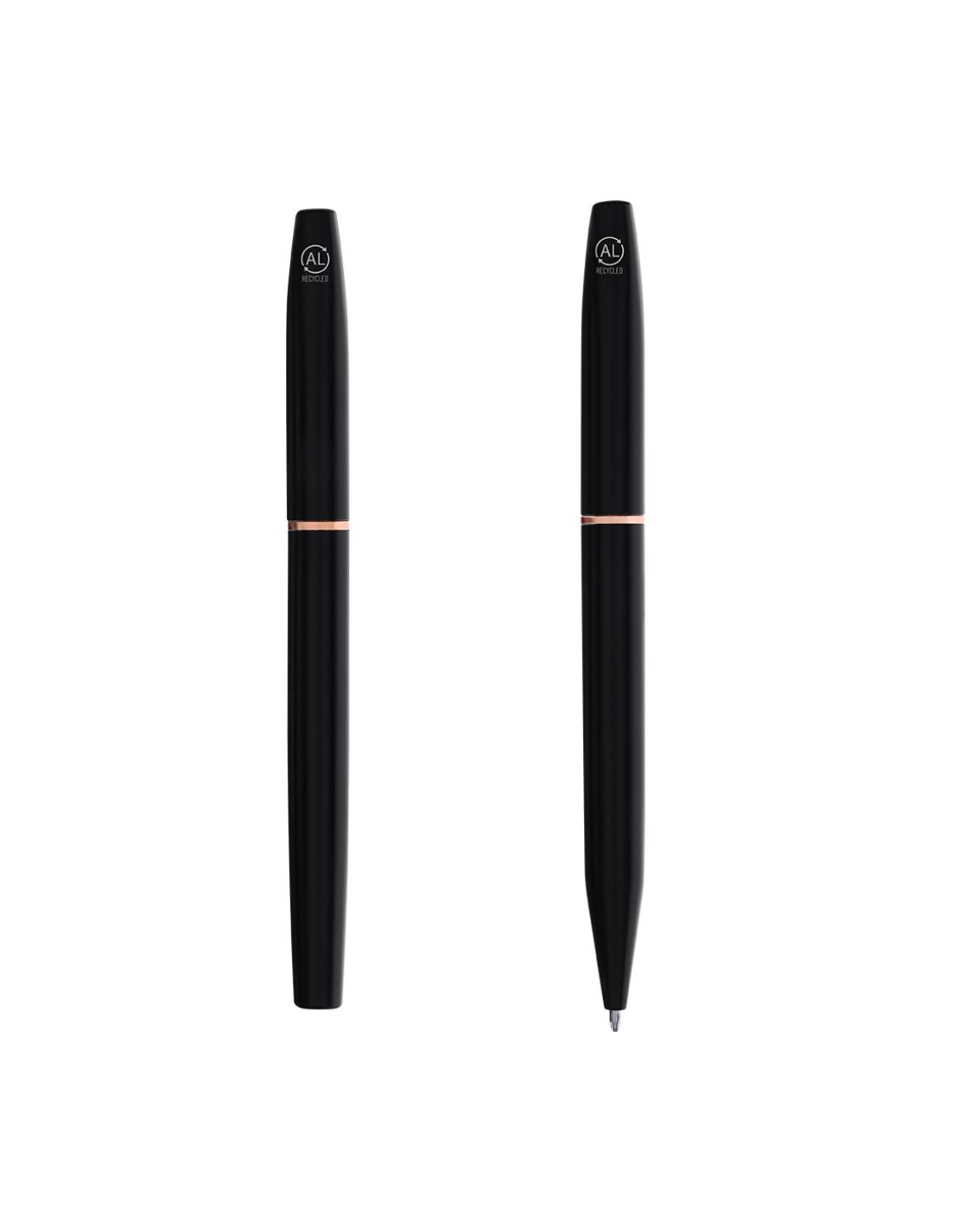 Set de bolígrafo y roller fabricados en Aluminio Reciclado, en elegante diseño negro mate con distinguidos accesorios en acabado oro rosa. Bolígrafo de mecanismo giratorio y roller con capucha, ambos con clip metálico. En tinta azul y logotipo de Aluminio Reciclado. Presentación en elegante estuche negro.El Aluminio Reciclado es un material con posibilidades de reciclaje casi infinitas, sin perder sus propiedades originales y consumiendo menos energía en este proceso.Certificación GRS (Global Recycled Standard / Estándar de Reciclaje Global), que garantiza el origen reciclado del material usado para fabricar el producto.