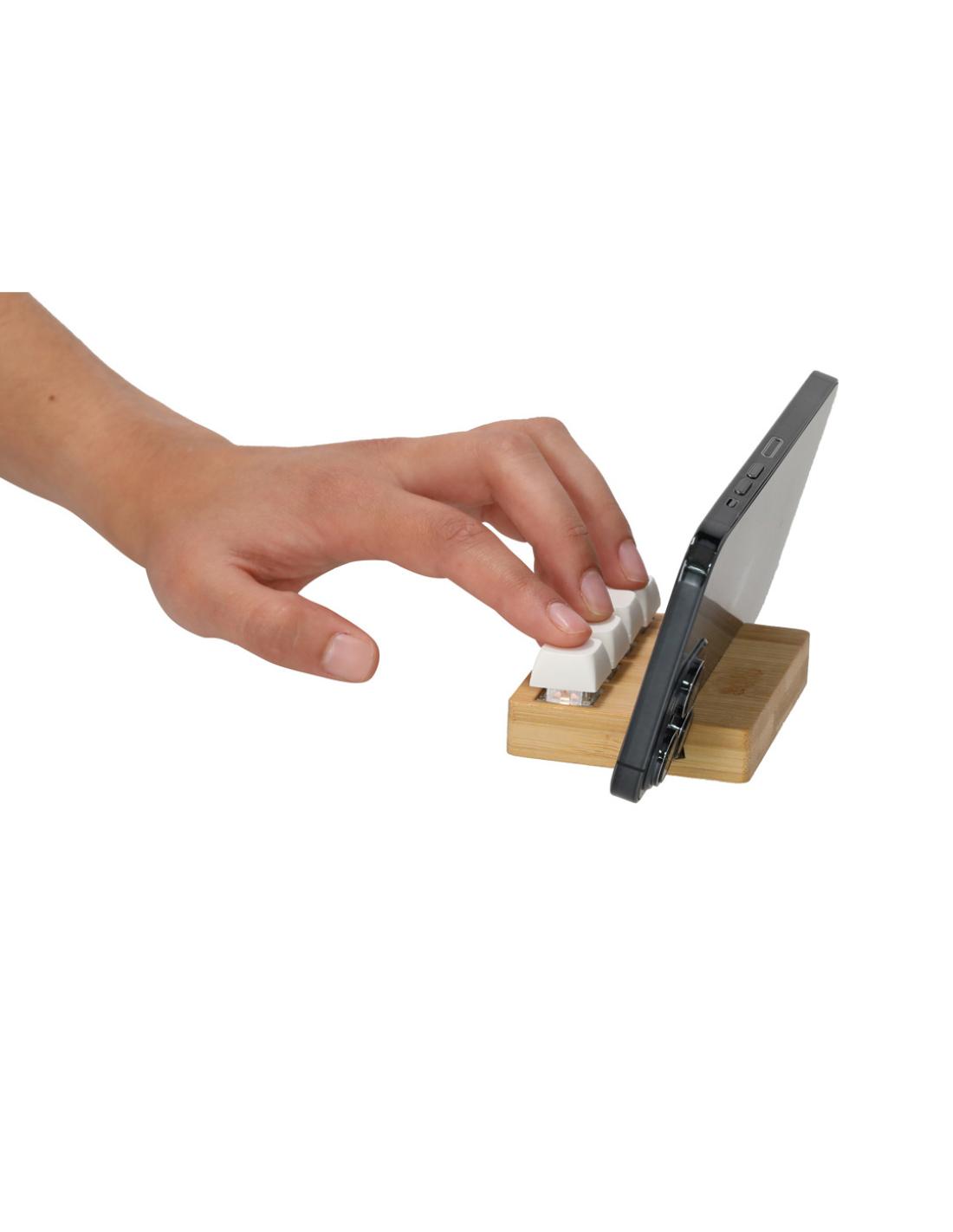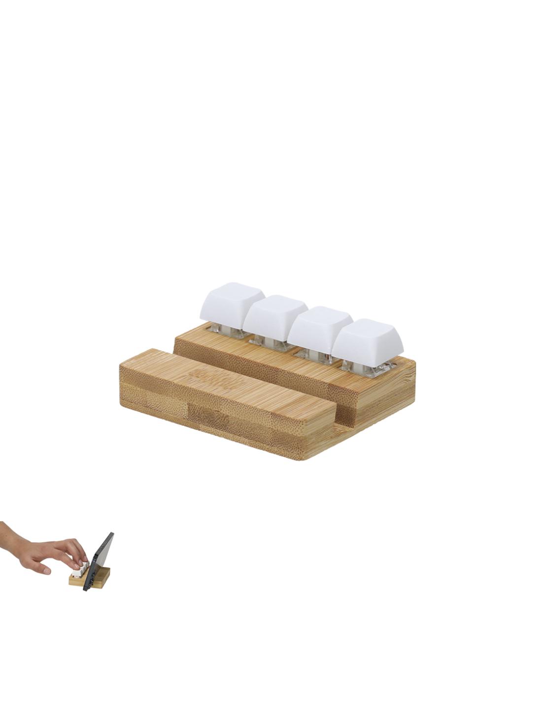 Original soporte antiestrés fabricado en bambú. Cuenta con cuatro teclas que imitan a un teclado mecánico, permitiendo pulsarlas de forma independiente tantas veces como sea necesario. Incluye un práctico soporte para dispositivos móviles, combinando funcionalidad y alivio del estrés en un elegante diseño.Materiales como el Bambú fomentan la utilización de materias primas naturales, reduciendo las emisiones contaminantes. Proviene de una planta de gran resistencia y versatilidad, con crecimiento y regeneración rápidos, siendo una excelente alternativa al uso de madera tradicional.