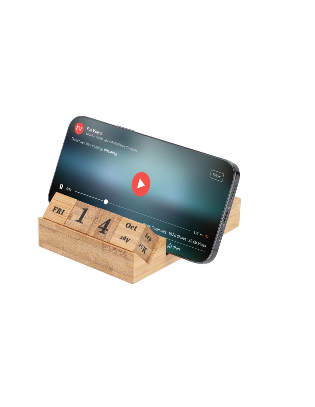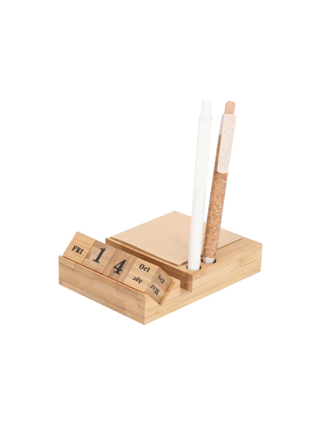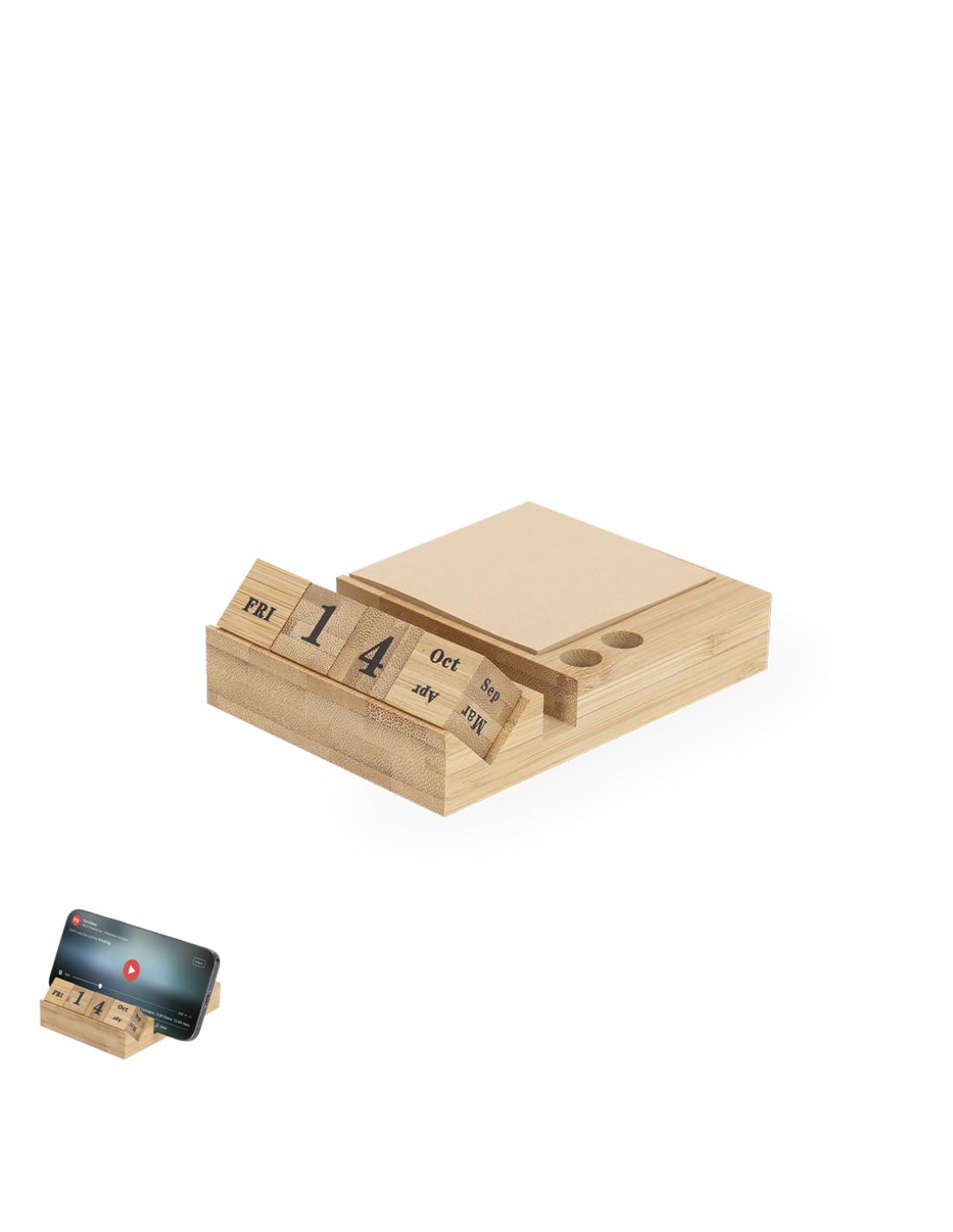 Portanotas calendario perpetuo con soporte, fabricado en bambú. Este elegante calendario perpetuo está compuesto por cubos que indican los días de la semana, los meses y los días del mes. Incluye soporte para smartphone, 100 notas adhesivas de papel kraft y soporte para dos bolígrafos. Perfecto para mantener tu escritorio organizado y estilizado.Materiales como el Bambú fomentan la utilización de materias primas naturales reduciendo las emisiones contaminantes. Además, el Bambú proviene de una planta de gran resistencia y versatilidad, con crecimiento y regeneración rápida, siendo una excelente alternativa al uso de madera tradicional.