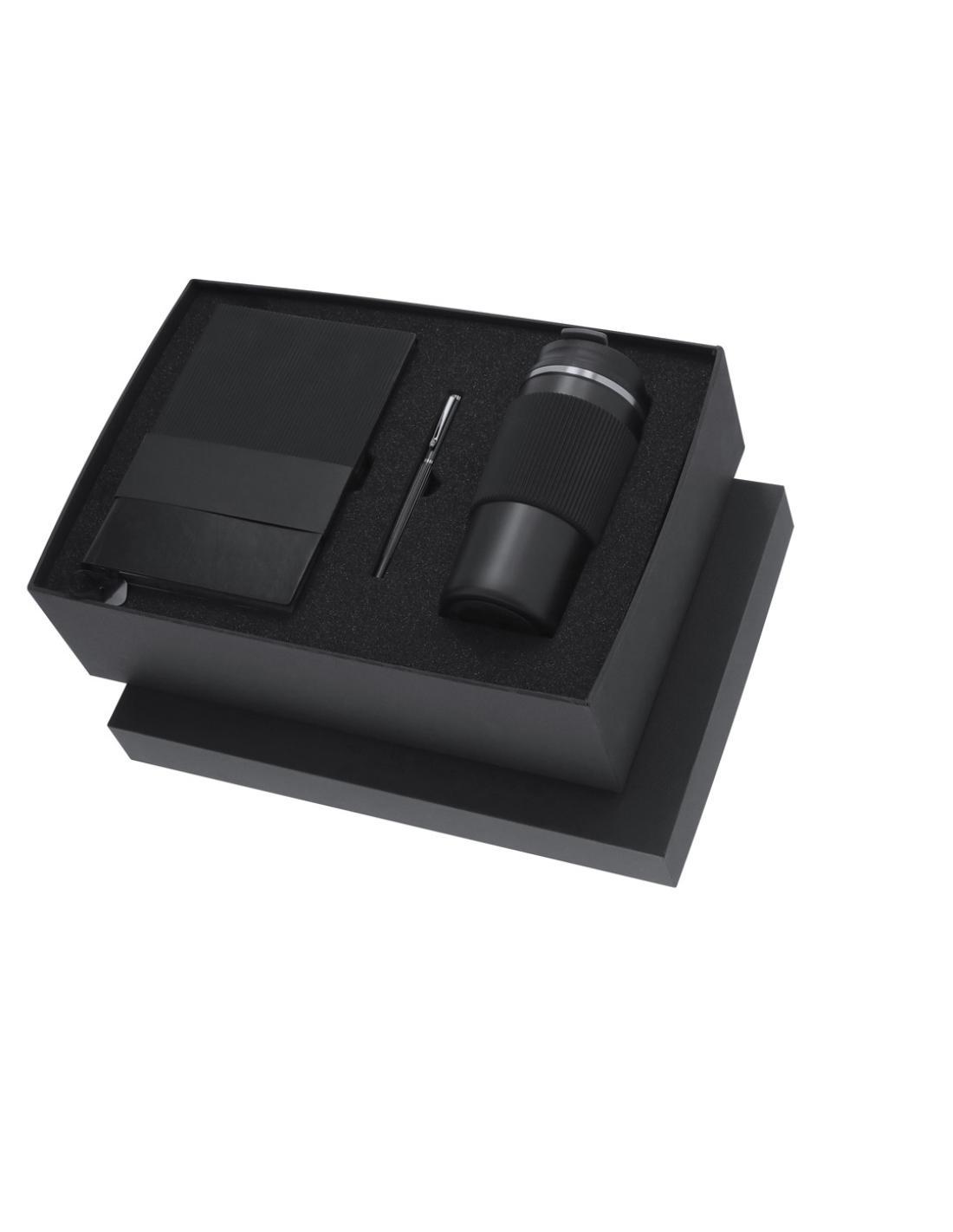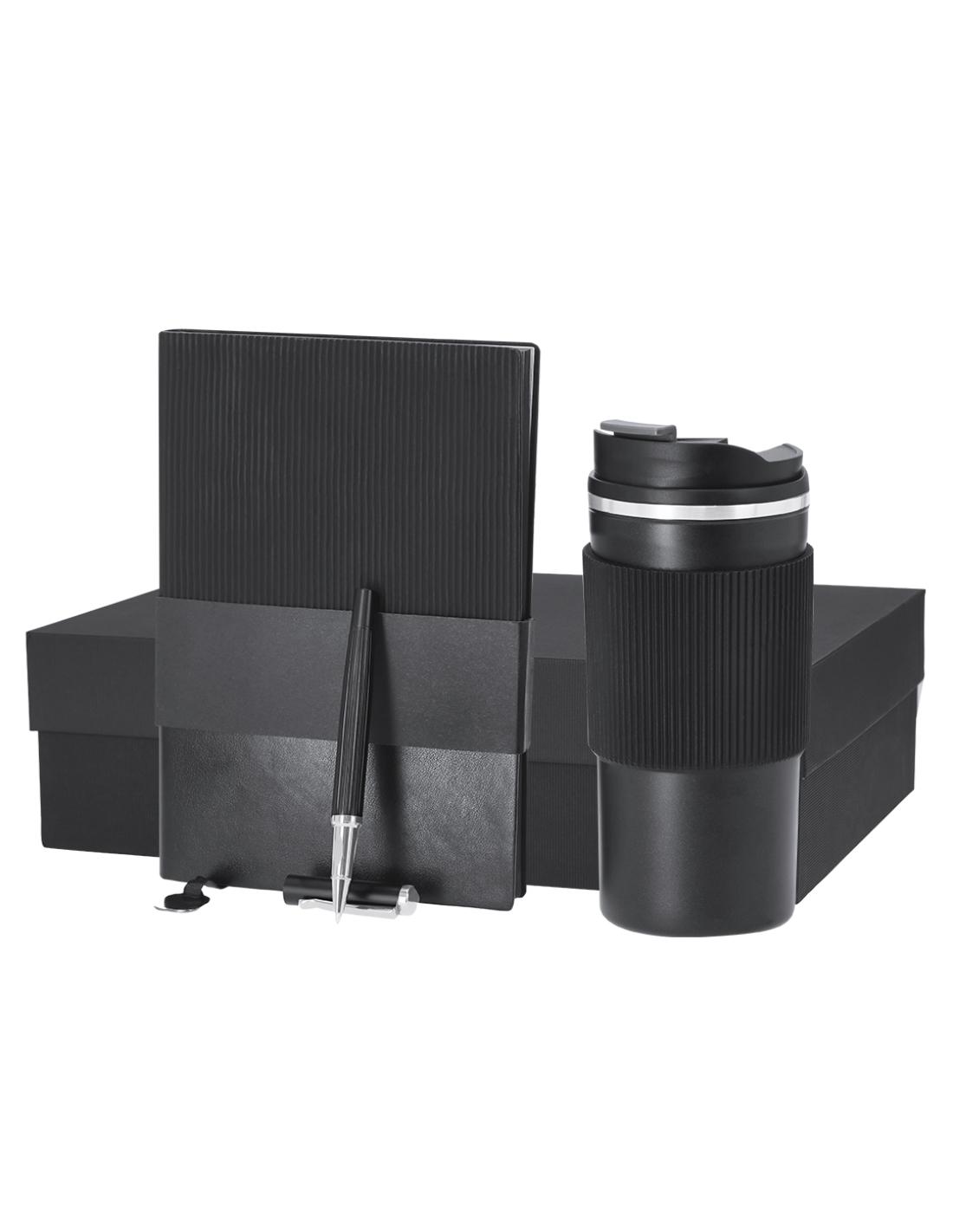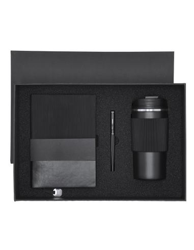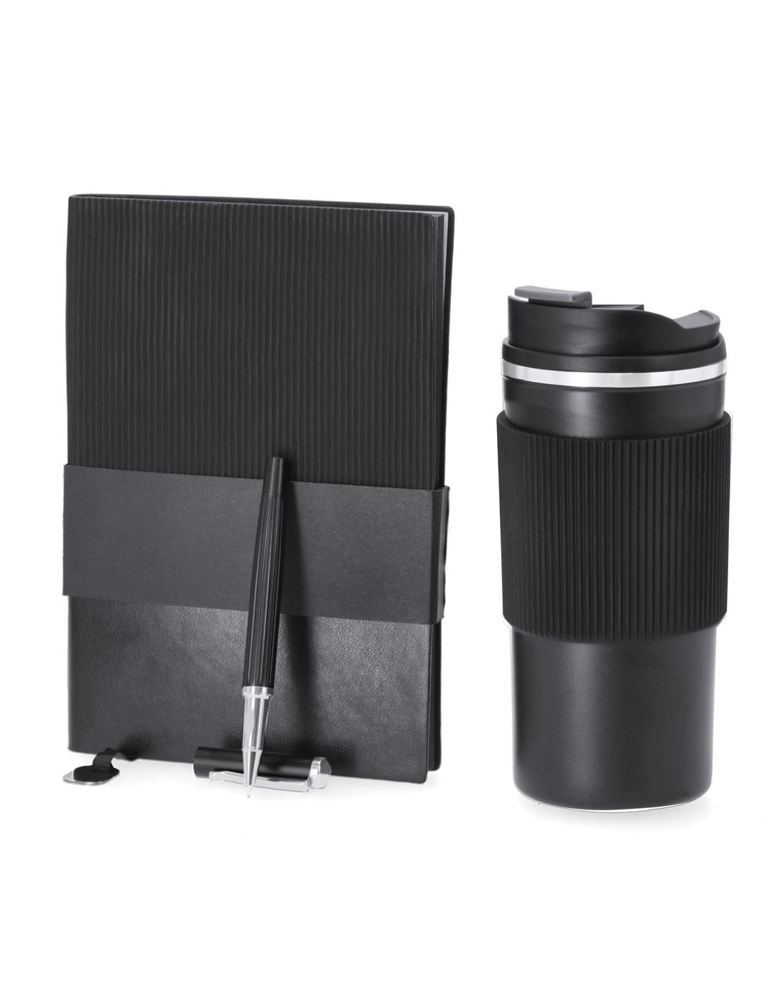 Elegante set premium. Incluye: - Vaso térmico fabricado en acero inoxidable de doble pared con capacidad de 470 ml. Con un dosificador en tapadera, libre de BPA, sistema de apertura abre fácil, banda de silicona a juego y base antideslizante. - Bloc de notas con tapas blandas fabricado en elegante PU color negro. Su diseño combina texturas lisas y biseladas. Incluye marcapáginas de tela con accesorio metálico especial para marcaje en láser. Interior con 100 hojas en color crema, de disposición a una raya y bordes en negro. - Roller de acabado negro mate con detalles metálicos en color plata. De cuerpo biselado, con cierre de capucha, clip y tinta azul. Cuenta con cómodo agarre en metal pulido.Presentado en sosfisticado estuche individual de acabado mate, con interior troquelado para cada uno de los elementos...