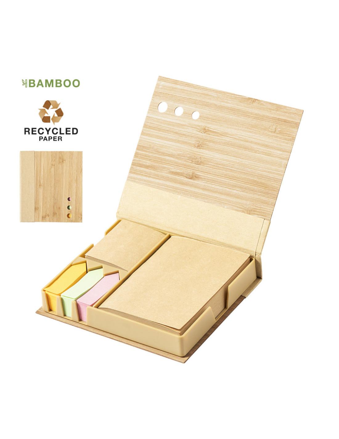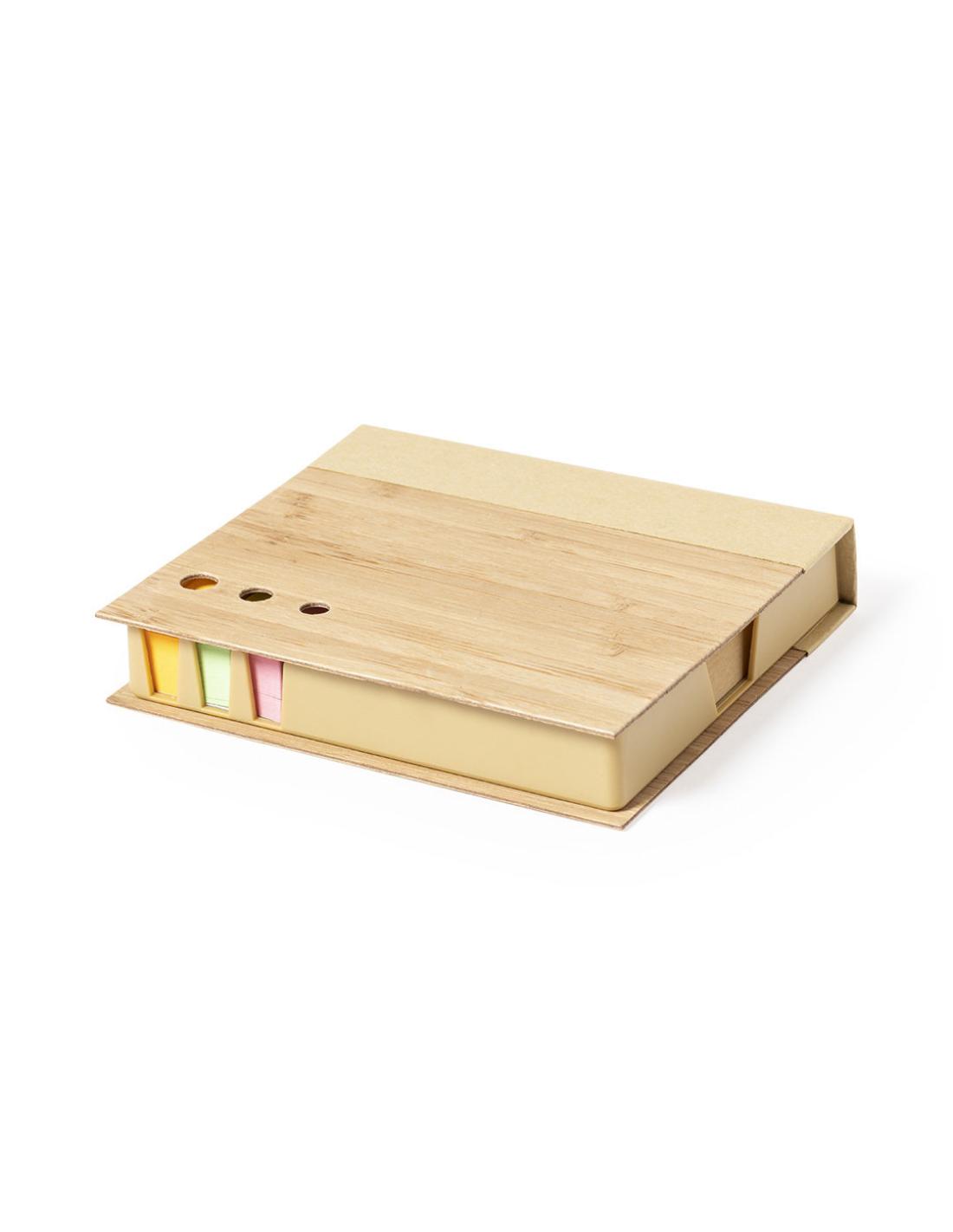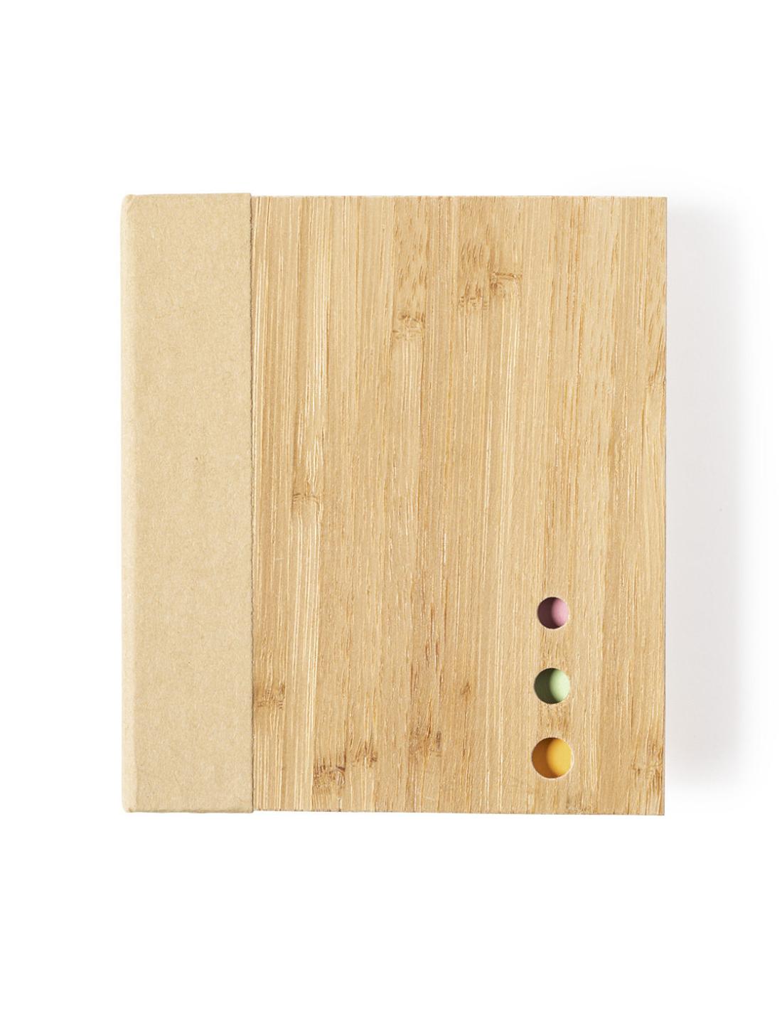 Portanotas de linea nature con tapas rígidas de bambú. Con 115 hojas adhesivas de acabado kraft, 115 hojas adhesivas medianas y 420 mini notas adhesivas.