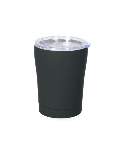 Vaso térmico fabricado en acero inox de doble pared y 350 ml de capacidad. Exterior en acabado caucho de acabado mate, especialmente diseñado para marcaje láser. Incluye tapa de cierre a presión transparente, con dosificador y de fácil apertura, libre de BPA. Es ideal para tener en tu escritorio, mesa o en cualquier superficie donde disfrutar tranquilamente de tu bebida favorita.
