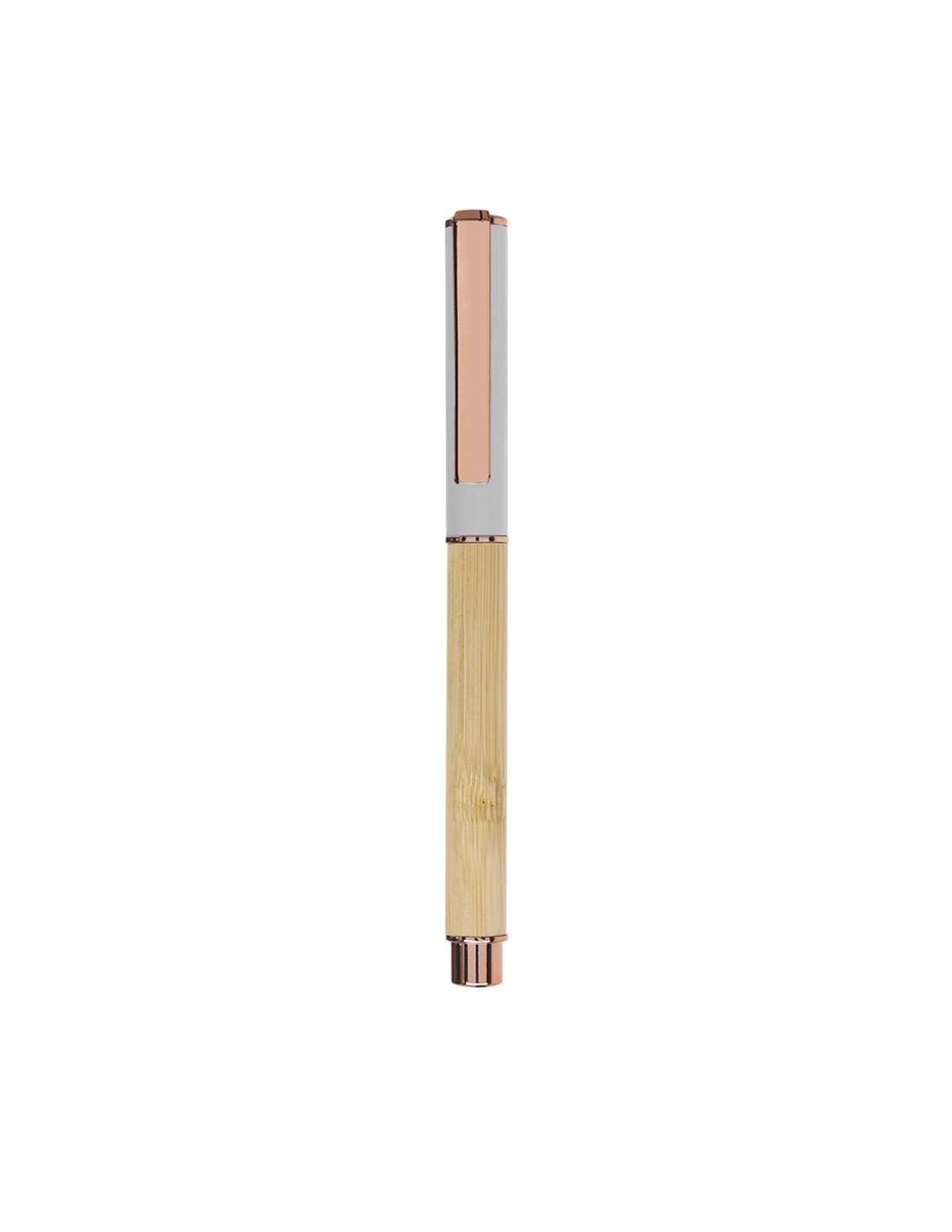 Elegante roller fabricado en bambú y aluminio. Con clip metálico, empuñadora y detalles de acabado oro rosa, caña fabricada en bambú y tapadera en aluminio. Con cartucho jumbo, en tinta azul y con cierre de capucha.